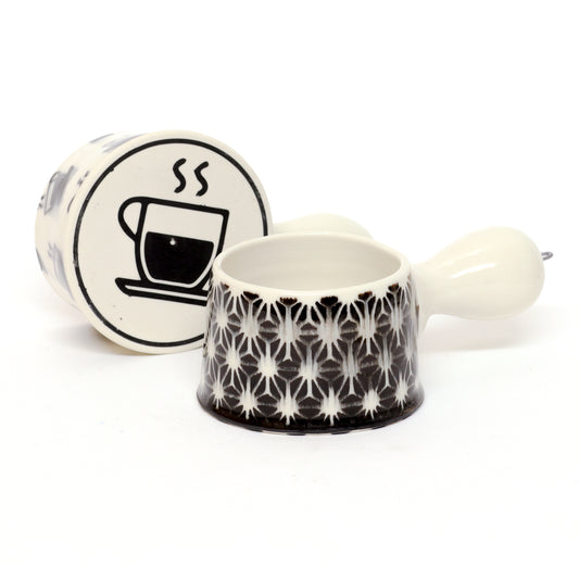 Chris Hosbach (he/him) creates ceramics that are primarily functional and meant to be used and appreciated daily. He enjoys making functional work because of the added layer of personal connection between the artist and the end user. Chris prefers to work in porcelain and is drawn to its softness and strength. Surface decoration has become the focus of Chris’ work. Custom vinyl stencils are created for each piece he produces. Having an interest in graphic design, pattern making, and technology, this process allows him to heavily utilize all three. Vibrant and colorful transparent glazes add extra depth to the finished piece through the interplay with various underglazes and stains. Exploration of new interactions between ceramic materials and the unexpected surprises revealed are few of the reasons Chris continues to work in this style. Chris is currently living in Taos, NM with his cat Paco.