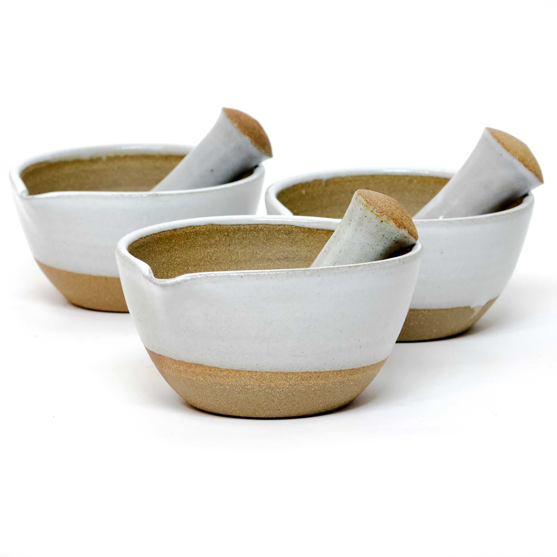 The Mortar and Pestle has been extensively tested in our kitchen and proven its durability and grinding powers. We make everything from dry rubs for meats to garlic and herb pastes for salad dressings and dips. The interior is unglazed allowing the stony texture of the ceramic to effortlessly do all the work. The mortar is 3.5 inches tall and 5.5 inches in diameter and holds up to 1 pint. The pestle is approximately 4 inches long.