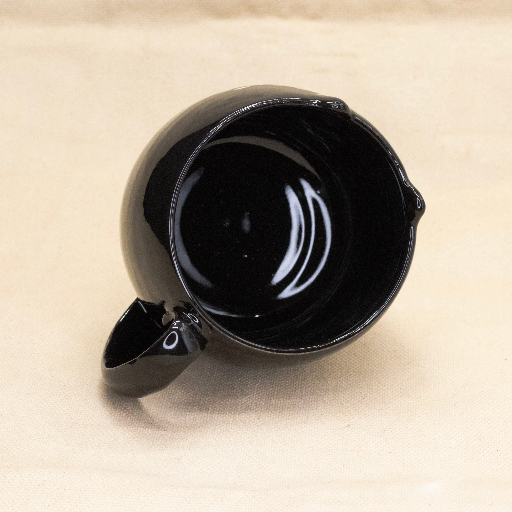Wheel thrown midrange stoneware form with hand sculpted elements. Glossy black interior and exterior with yellow eyes. Microwave and dishwasher safe, holds 12 oz.