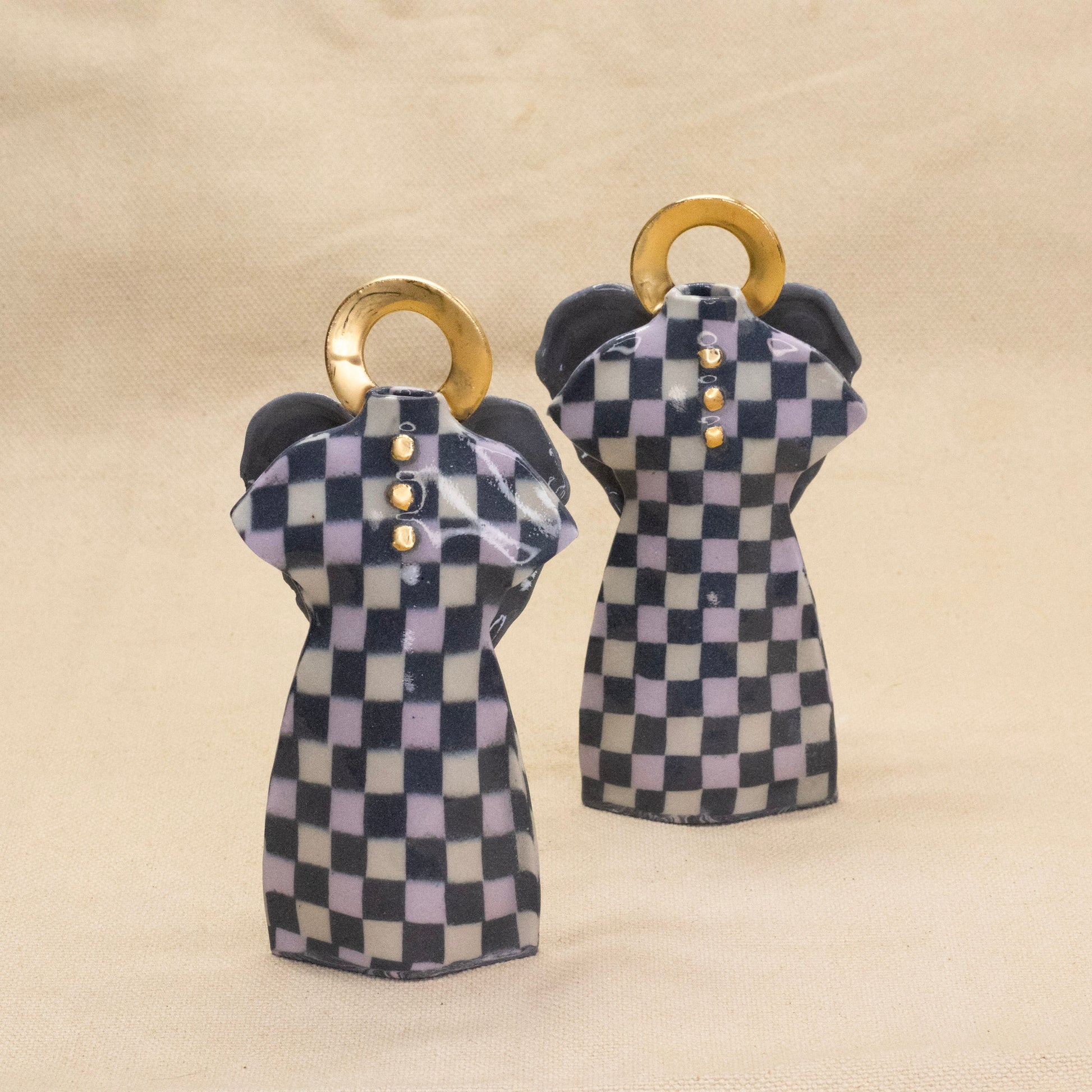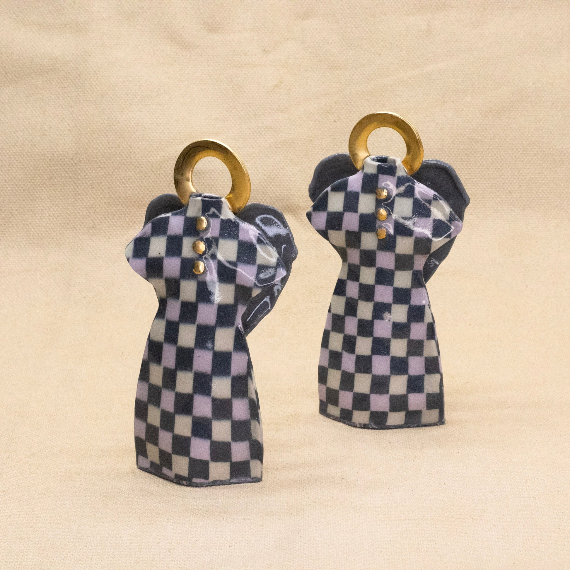 This porcelain bud vase features a design reminiscent of a doll's dress. Created using the nerikomi technique, different colored clays are combined like fabric to form a flat dress shape.