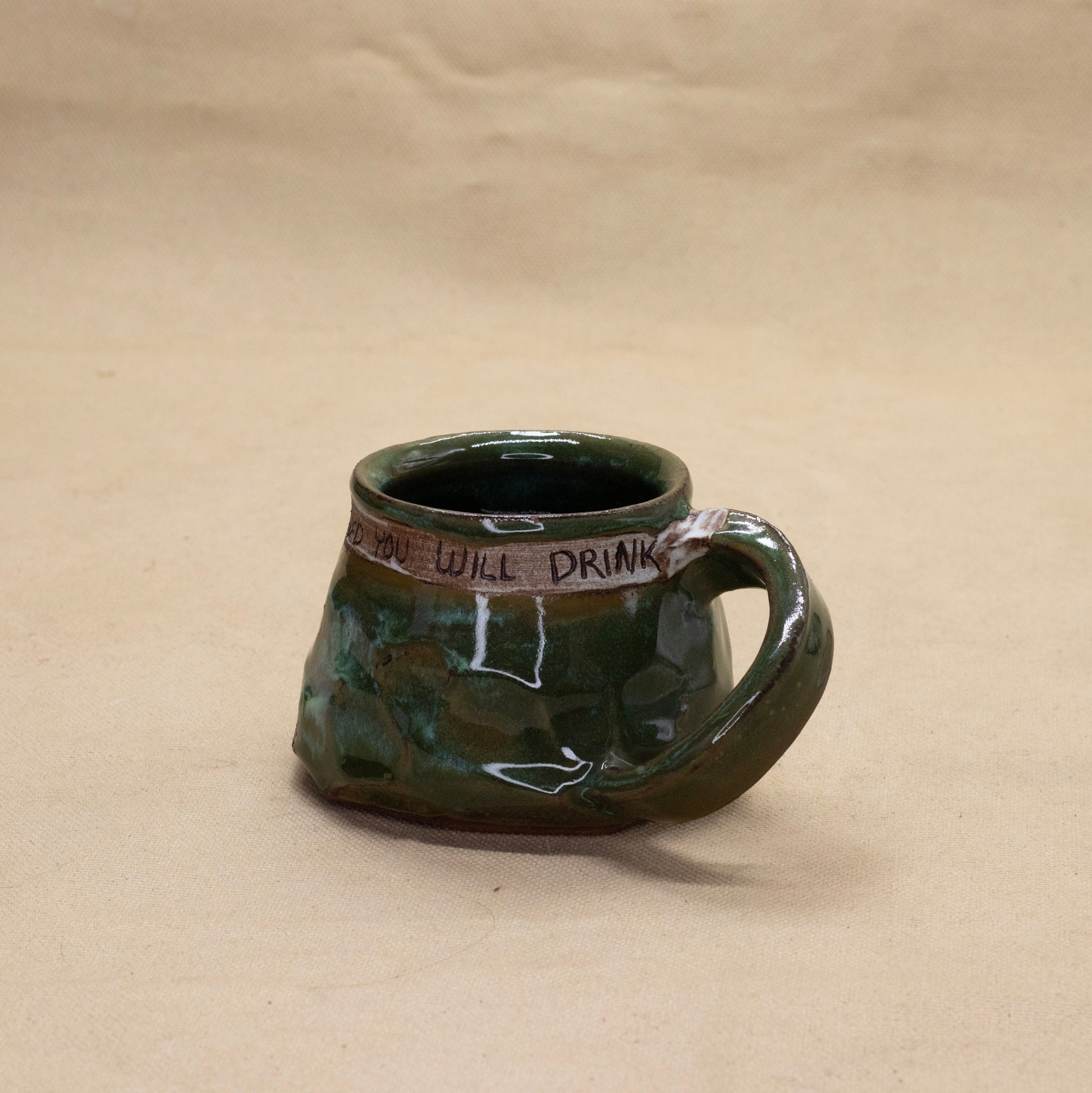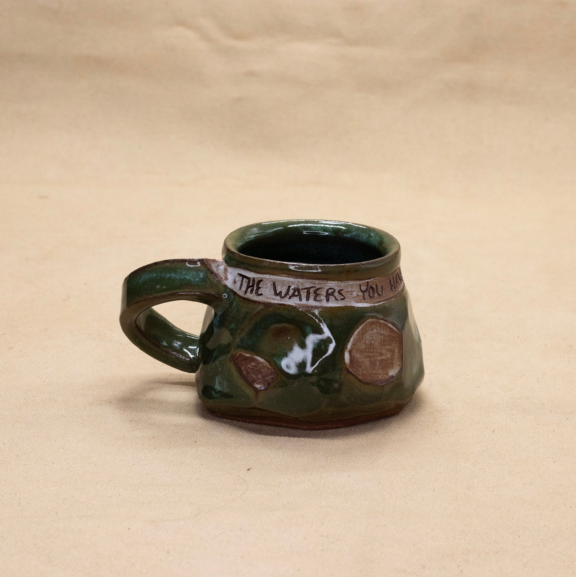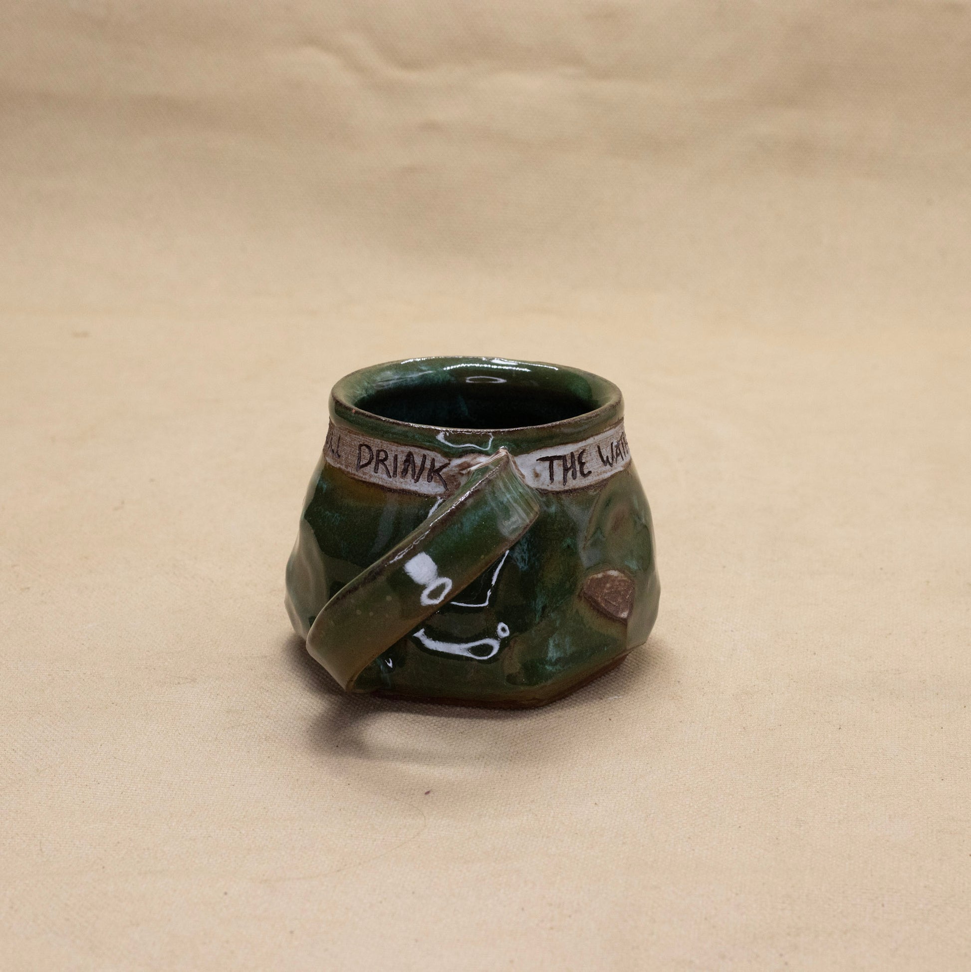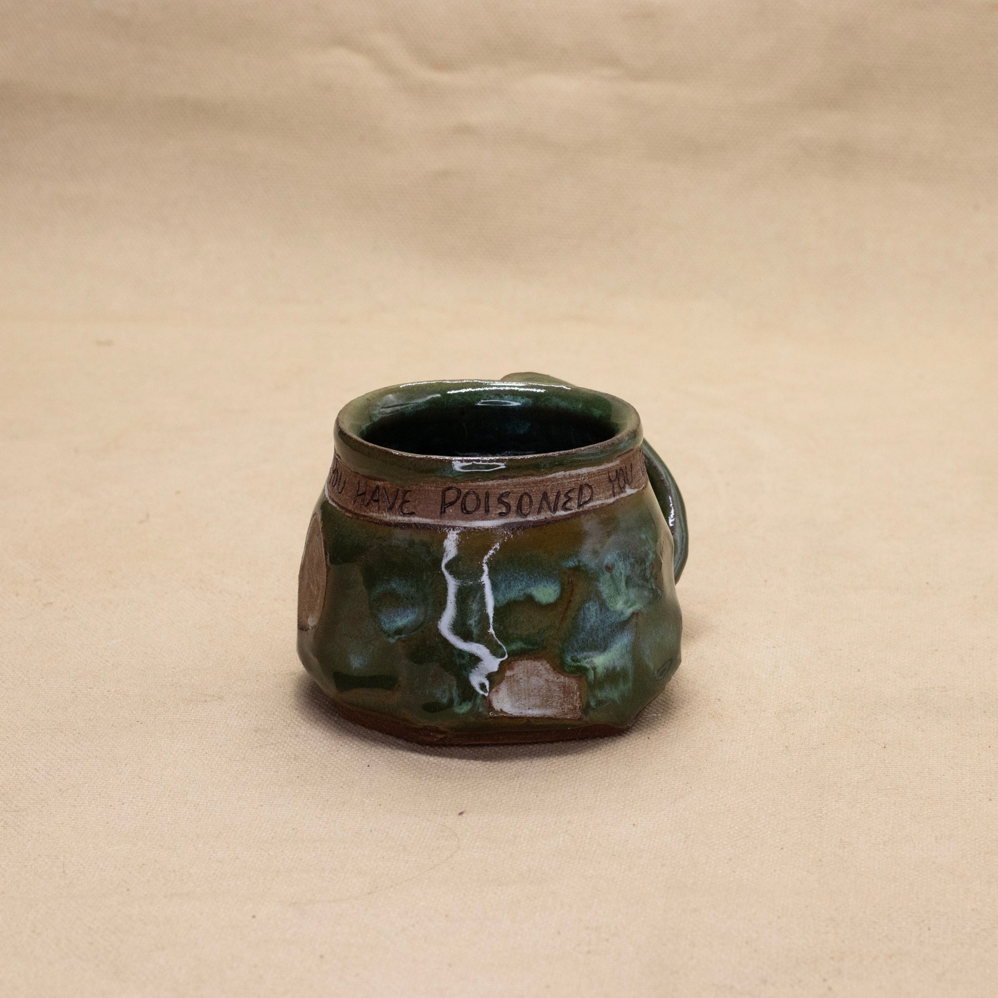 "The waters you have poisoned you will drink" inscription, red clay body, faceted exterior with a green glaze. Microwave and dishwasher safe, holds 10 oz.