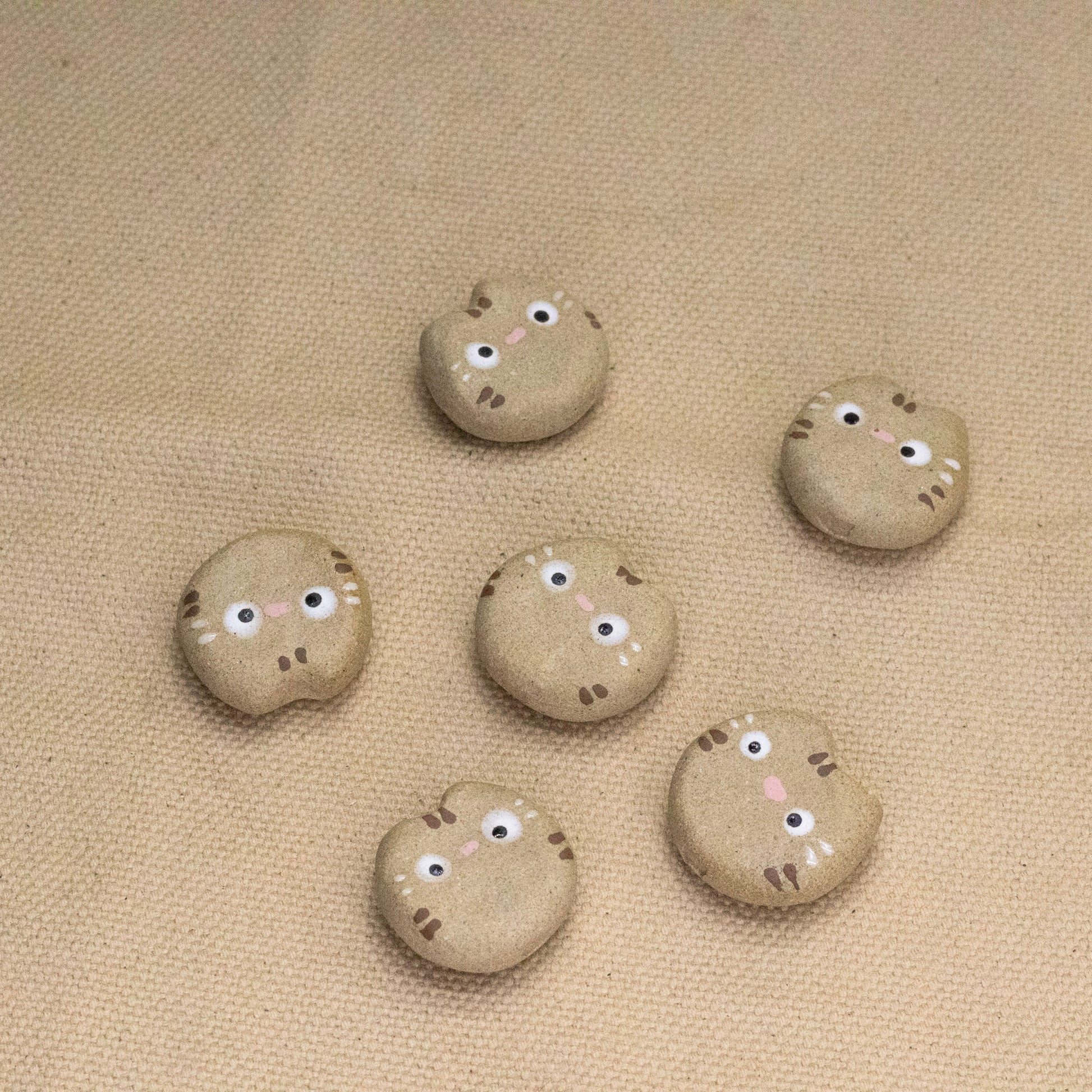Handsculpted brown tabby kitty magnets. Sold individually, each measures approx. 1" tall and 1" wide.