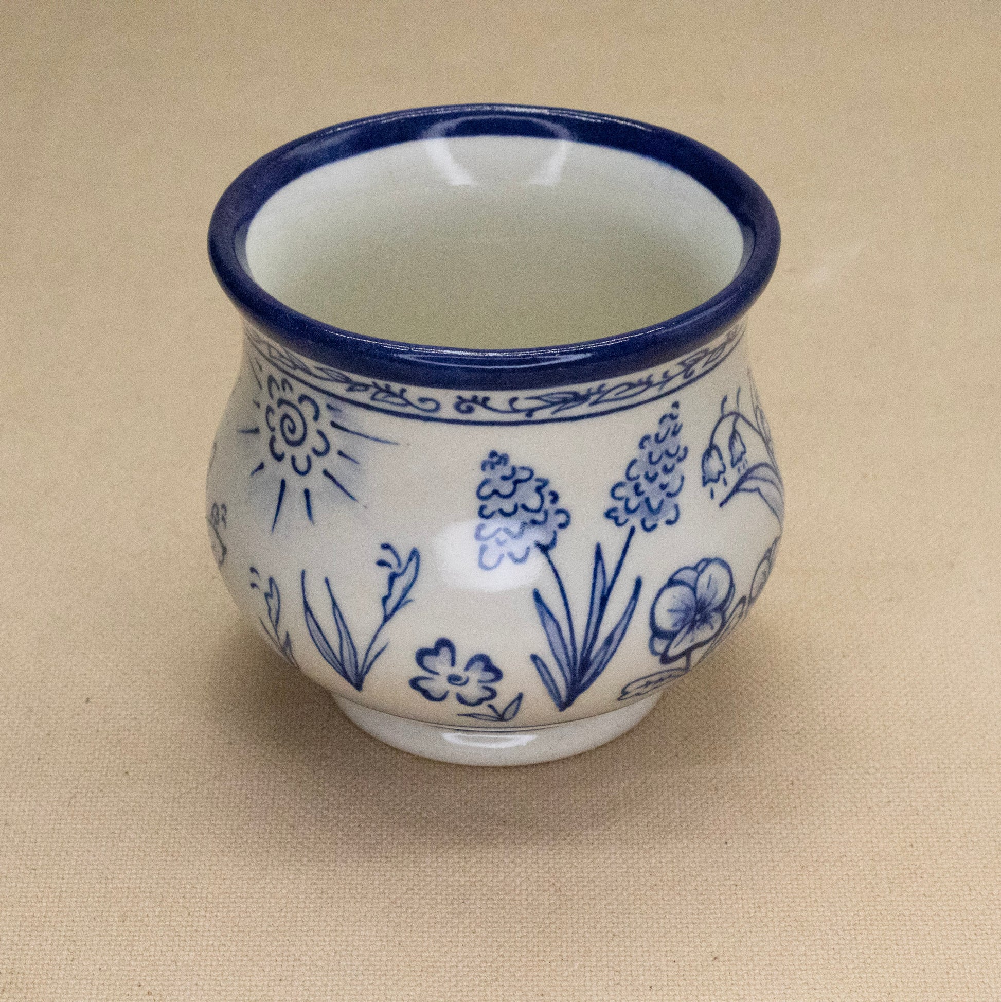 Carefully handpainted with underglaze. Microwave and dishwasher safe. Holds 13 oz, and measures 4" in diameter and 4" tall.