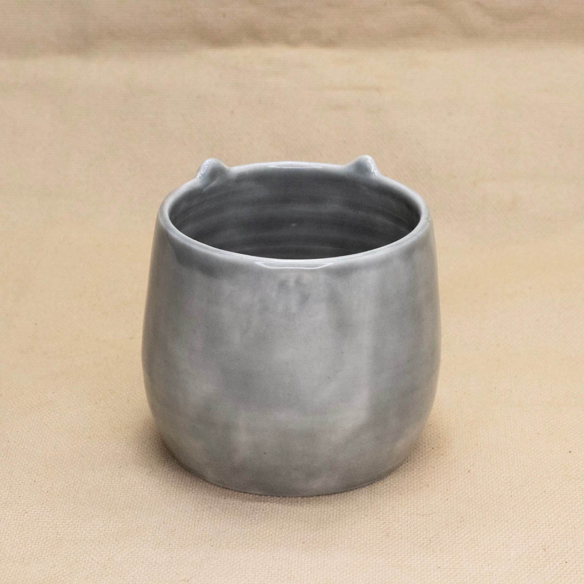 Wheel thrown midrange porcelain with hand sculpted ears. Gloss grey glazed interior and exterior. Interior measurements: 3" in diameter and 3" tall. Microwave and dishwasher safe.