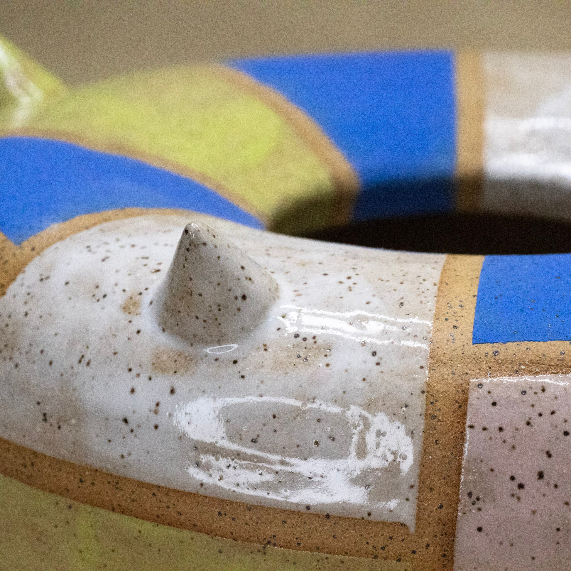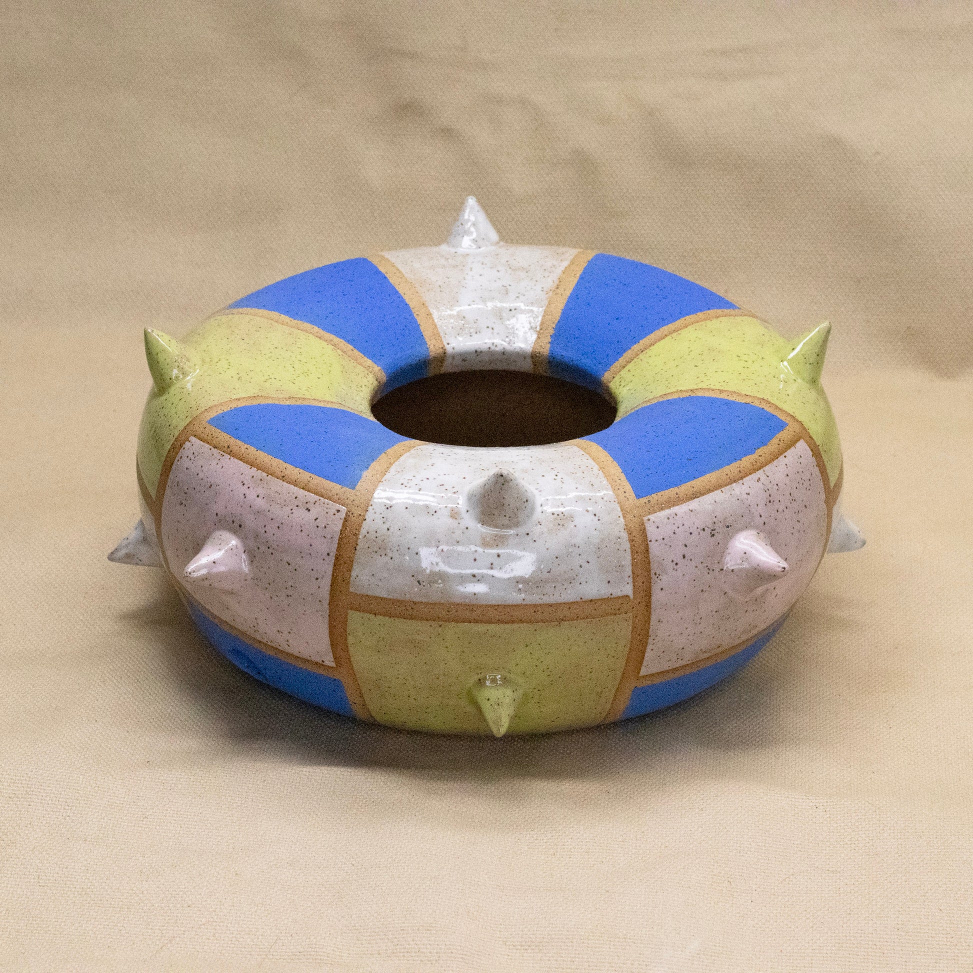 A wheel thrown and altered spiky donut vase with a checkered glaze pattern. Can be used as a planter, a lamp, or a vase for fake flowers. 8" by 4".