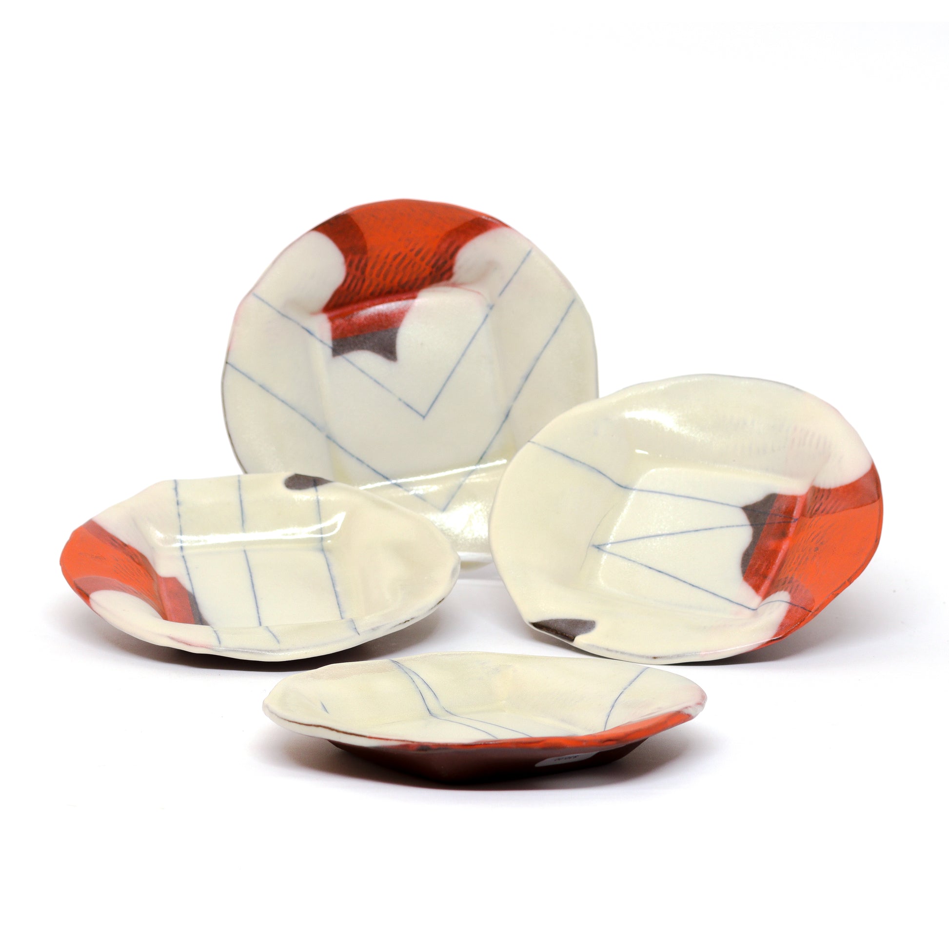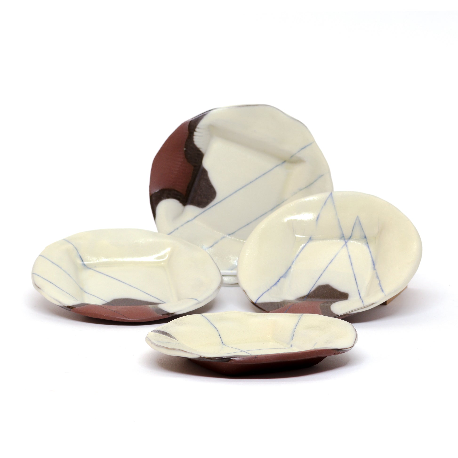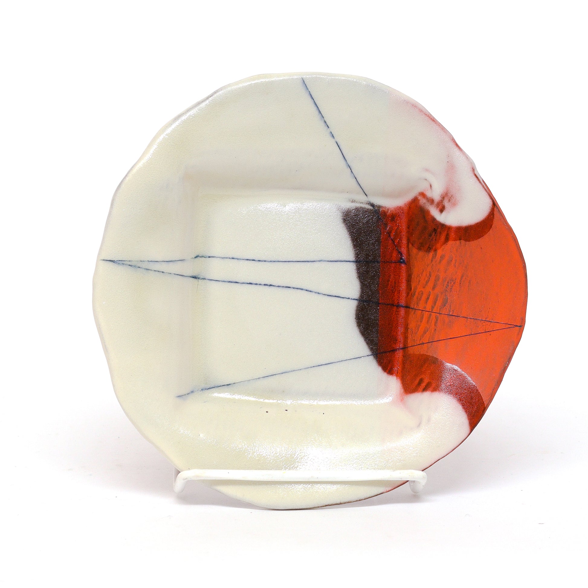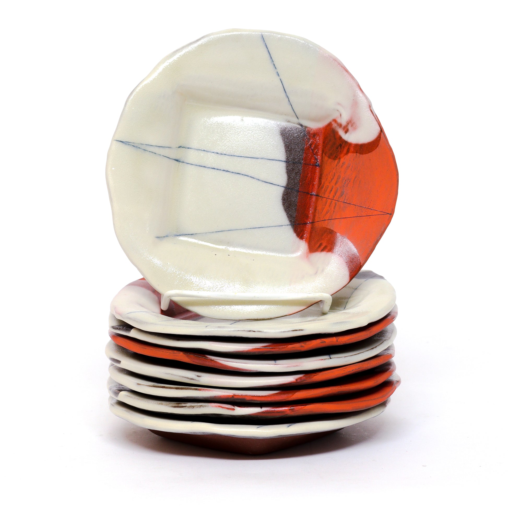 Small snack or salad plate made from red earthenware and finished with slips and glaze and fired to cone 6. 6"x 0.5". Each one is unique.