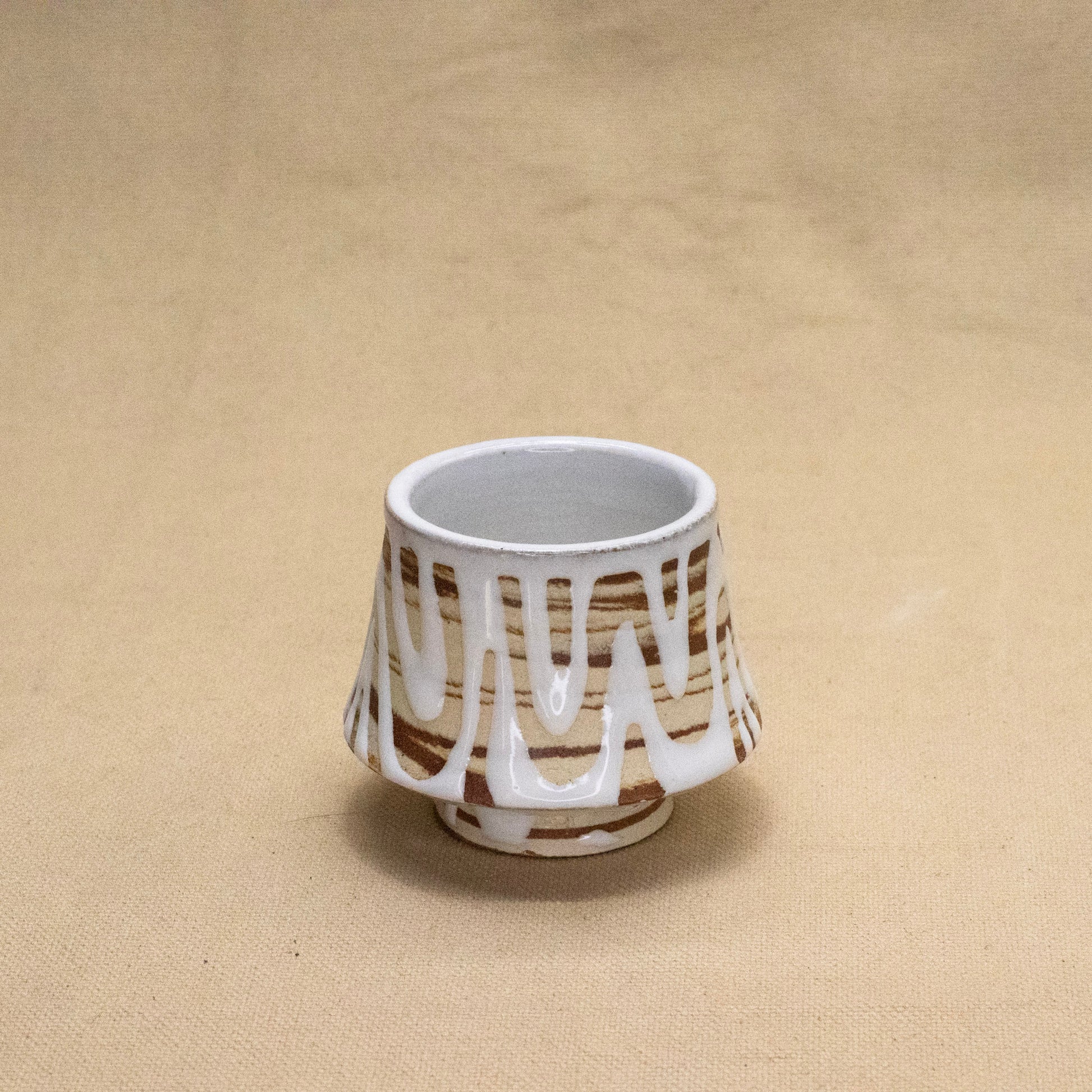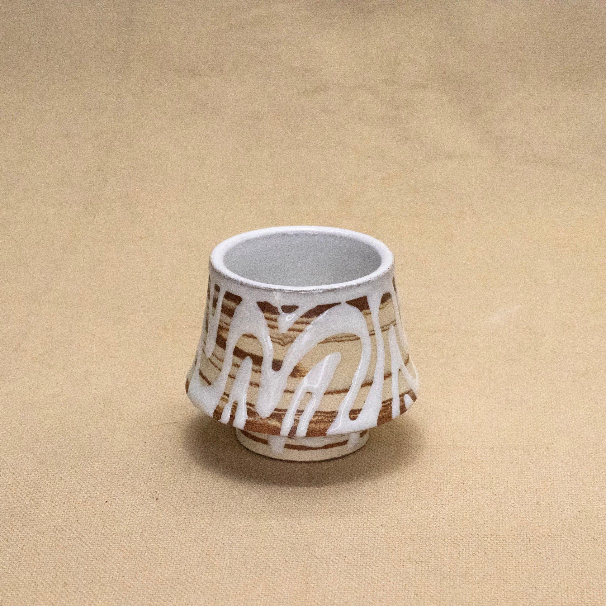 A cup with a wavy pattern on the outside. Microwave and dishwasher safe. Holds 5 oz.