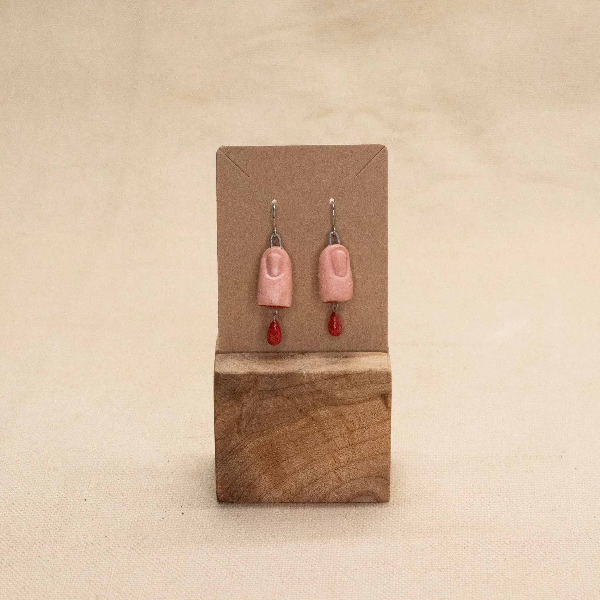 Stoneware, underglaze, hypoallergenic metal. Each earring is about 1" long.