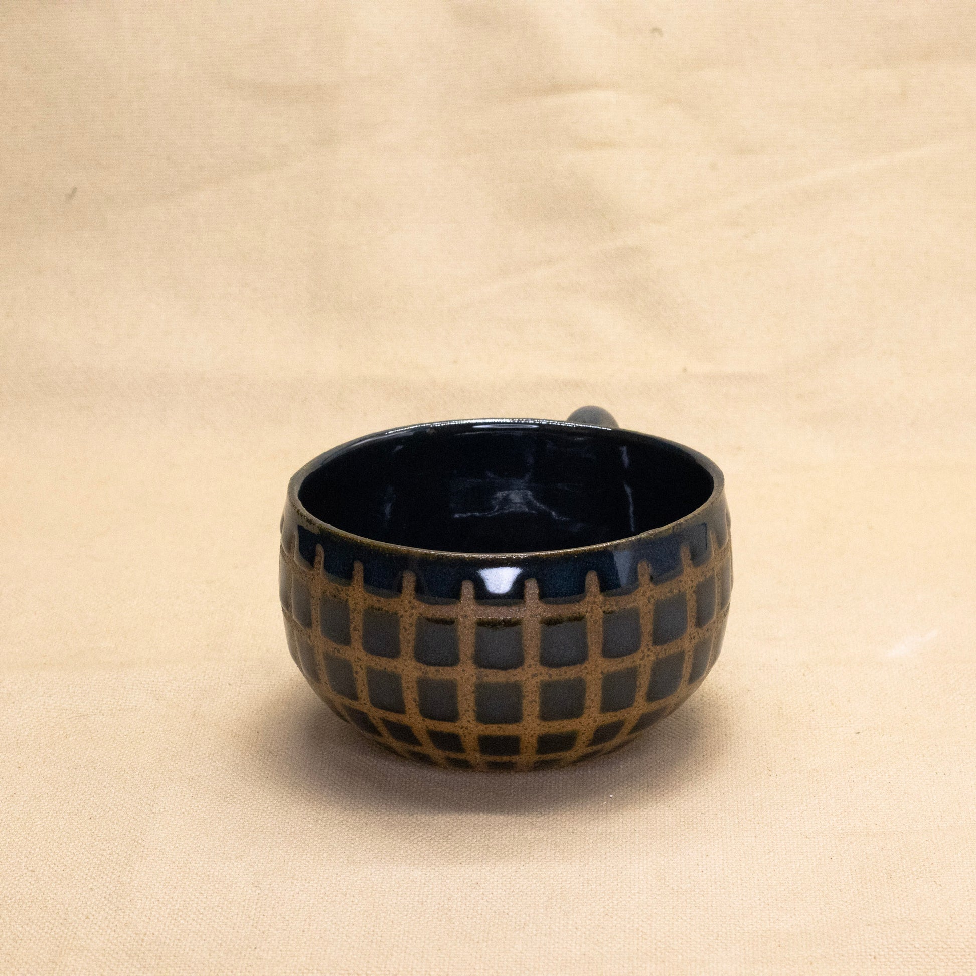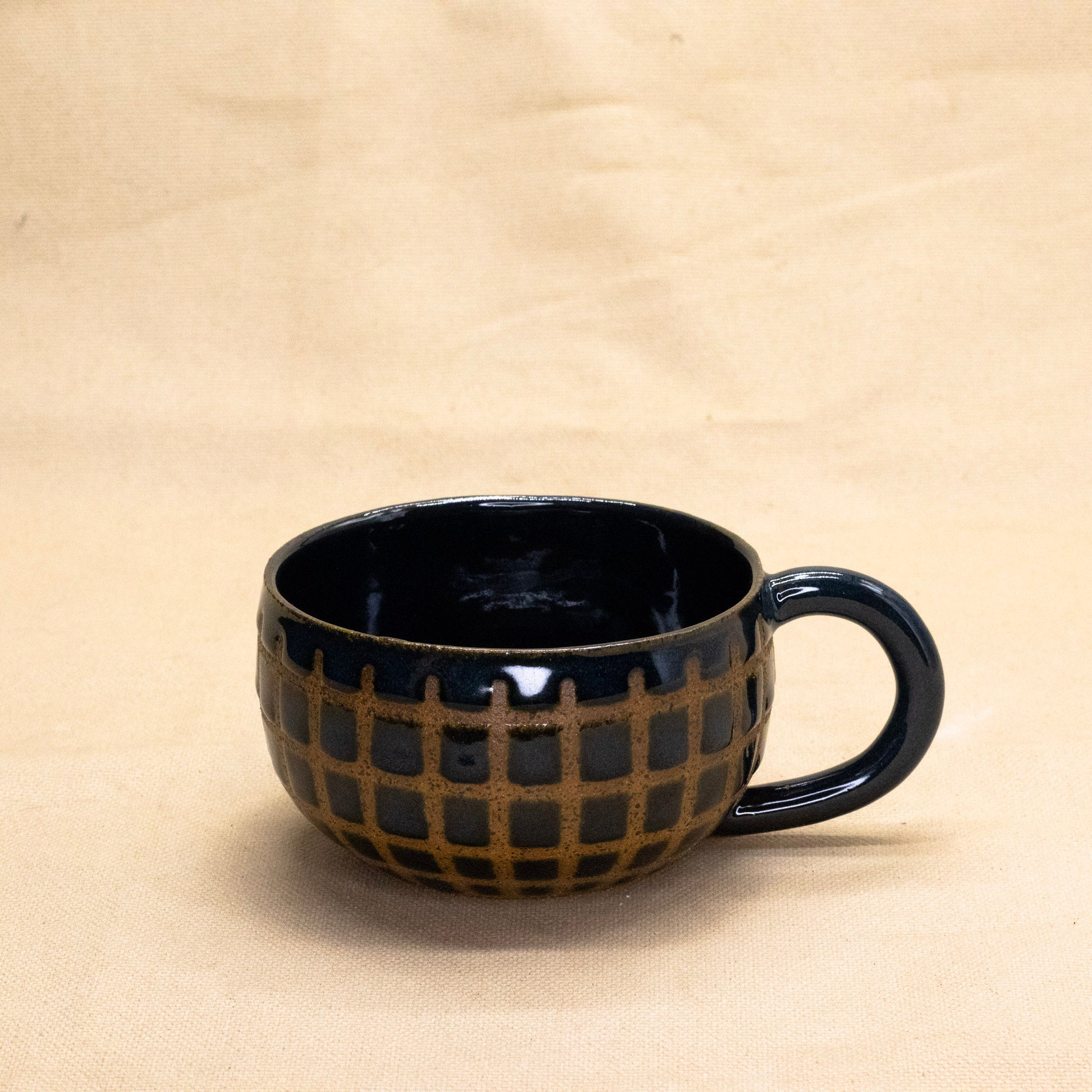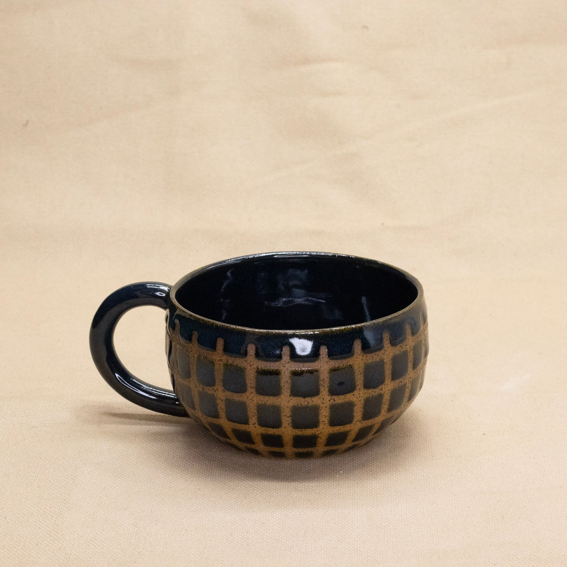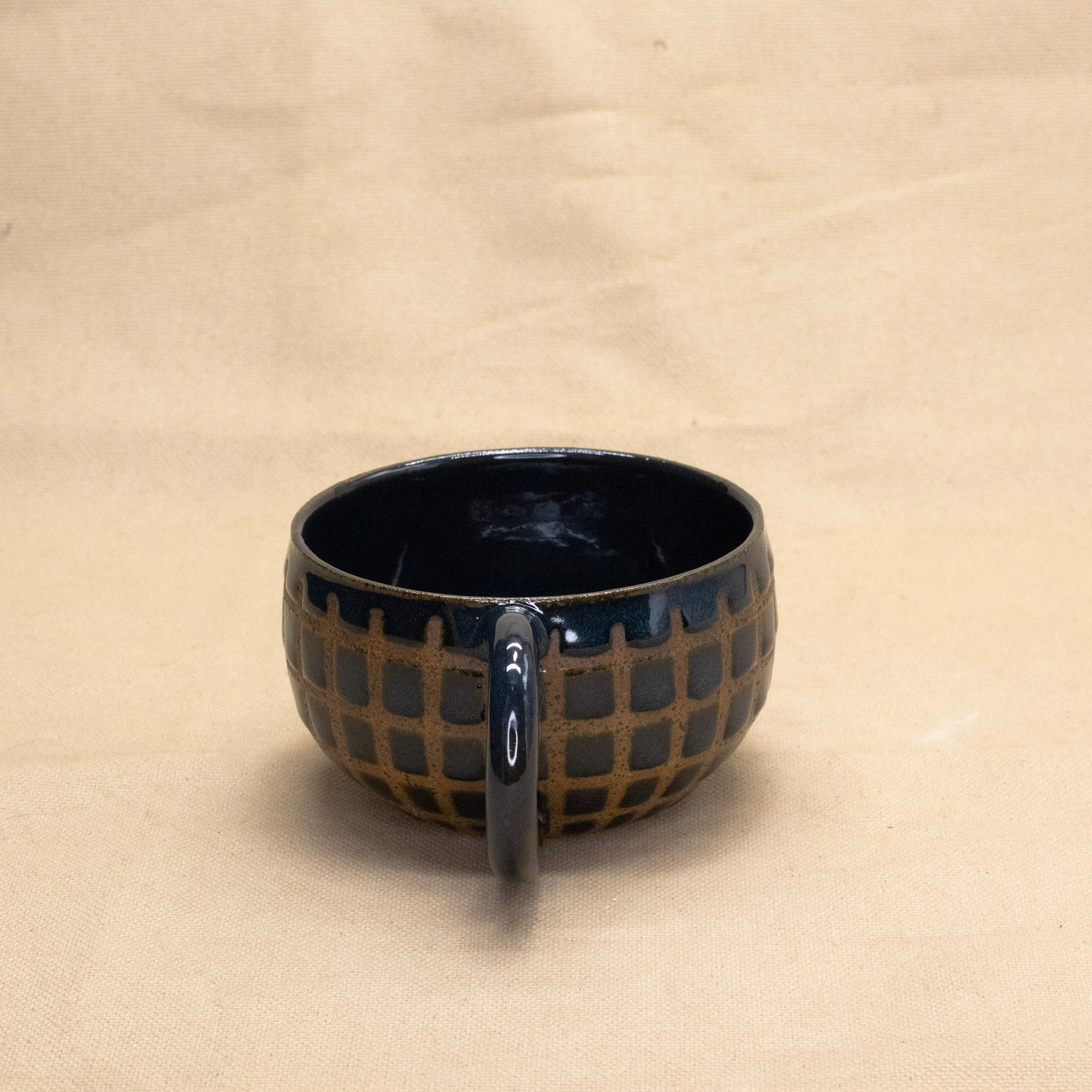 Wheel thrown handled mug made with Laguna Speckled Buff Clay, hand taped lattice pattern and dipped in Emerald glaze. Microwave and dishwasher safe, holds 14 oz.