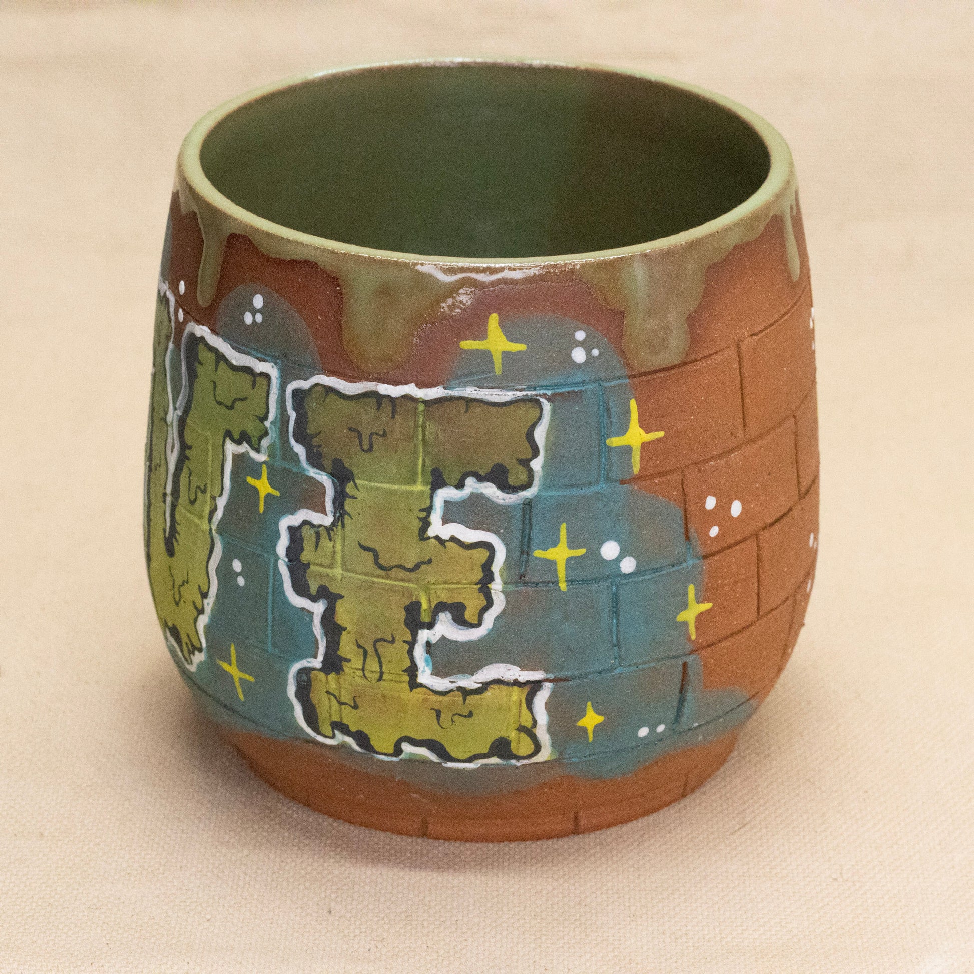 The evolve motif came from my first time using underglaze and starting my journey with ombre lettering. Each time I make this design it evolves with me. Microwave and dishwasher safe. Measures 4.5" in diameter and 4.75" tall.