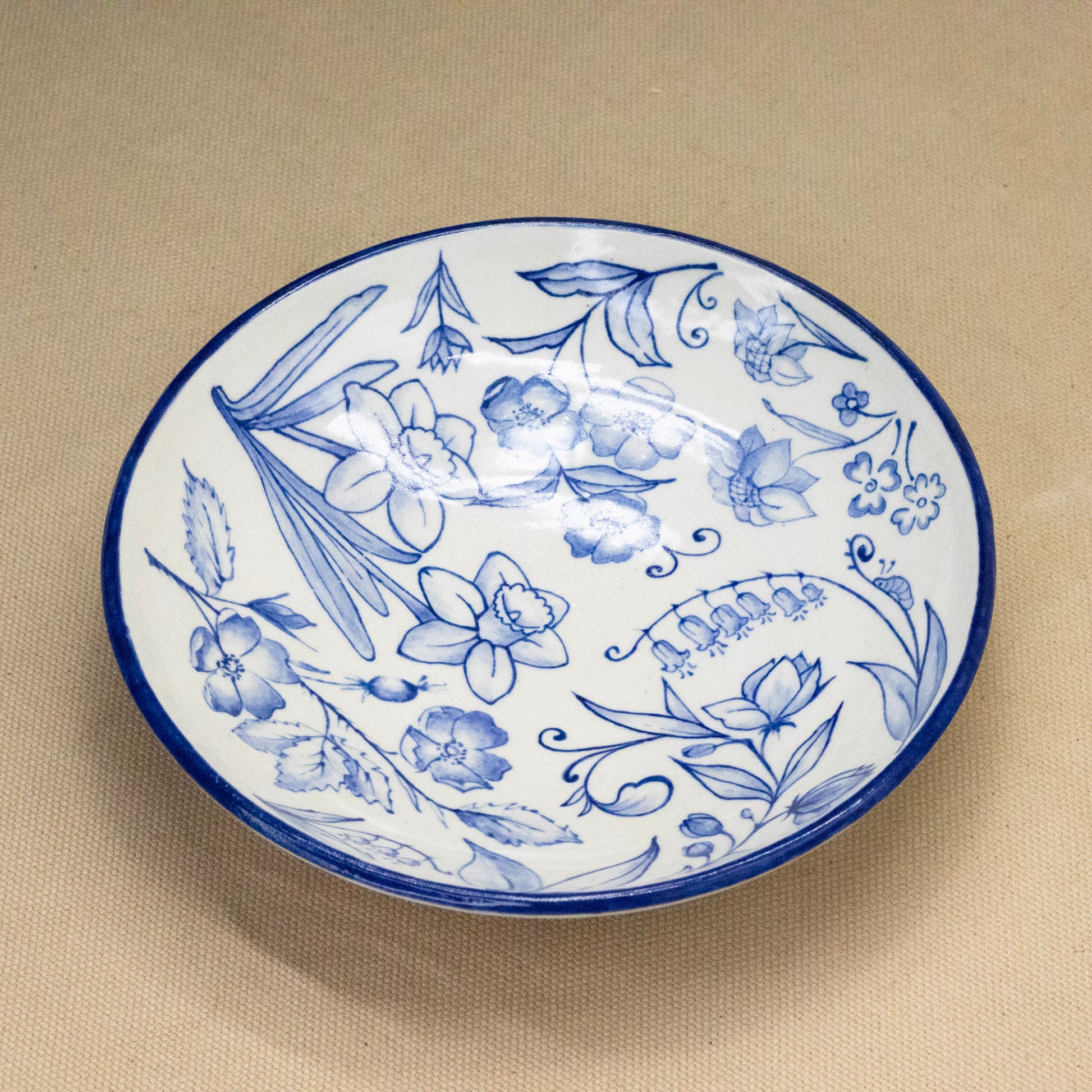 Carefully handpainted with underglaze. Microwave and dishwasher safe. Measures 7.75" in diameter and 1.5" tall.