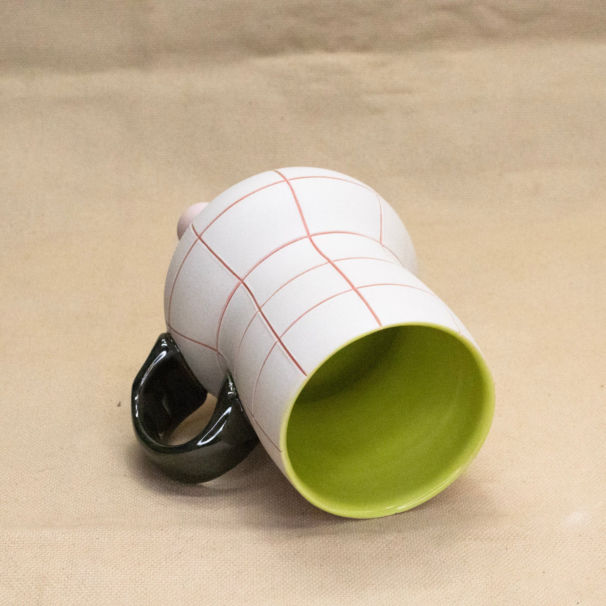 Slipcast and hand carved mug made to hold your favorite beverage. Materials: porcelain, ceramic stain, glaze. Microwave safe, handwash recommended. Holds 16 oz.