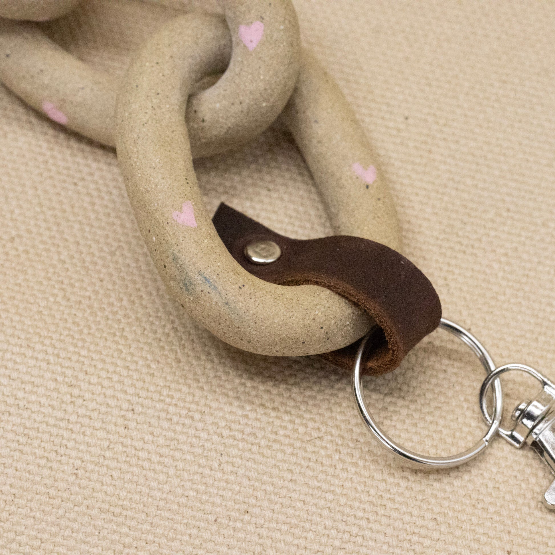 A pink heart with bloody horns on a clay chain, attached with a leather keychain. Hang it from your bag, your pants, or your keys. Hold the heart in your fist for an added layer of protection.