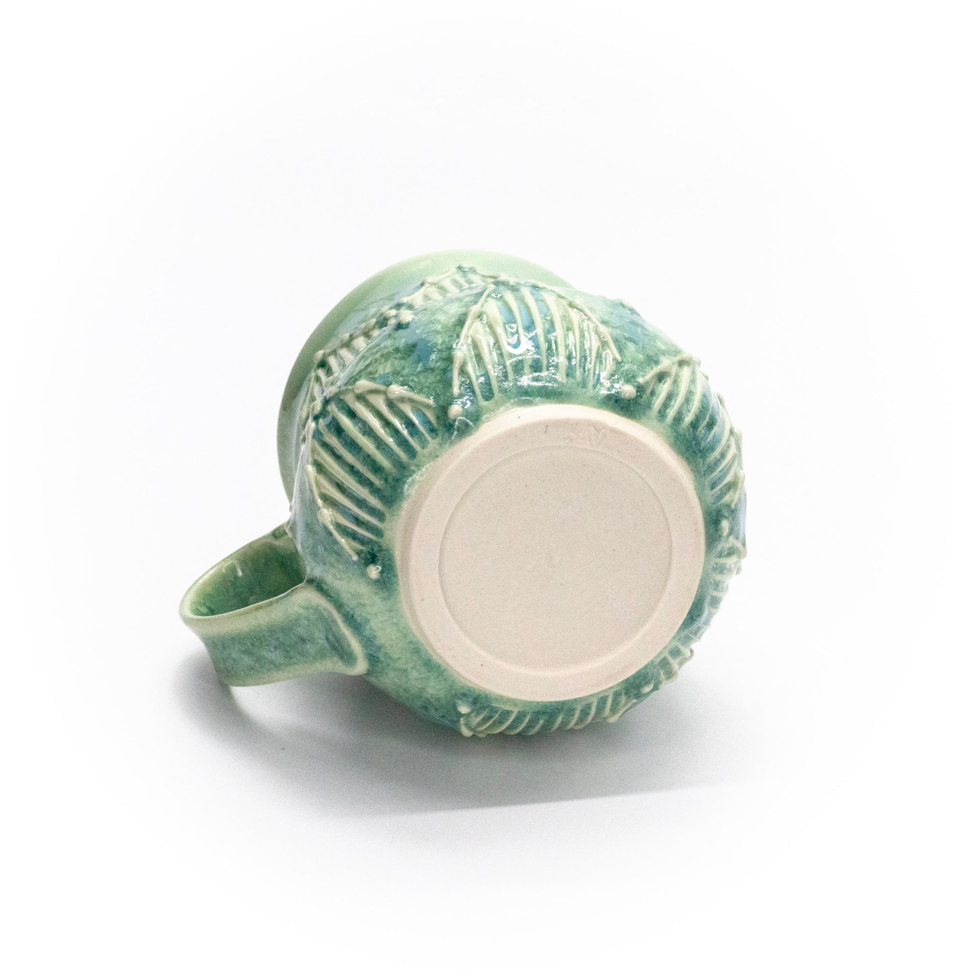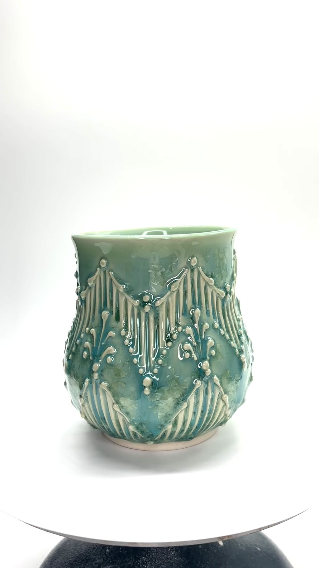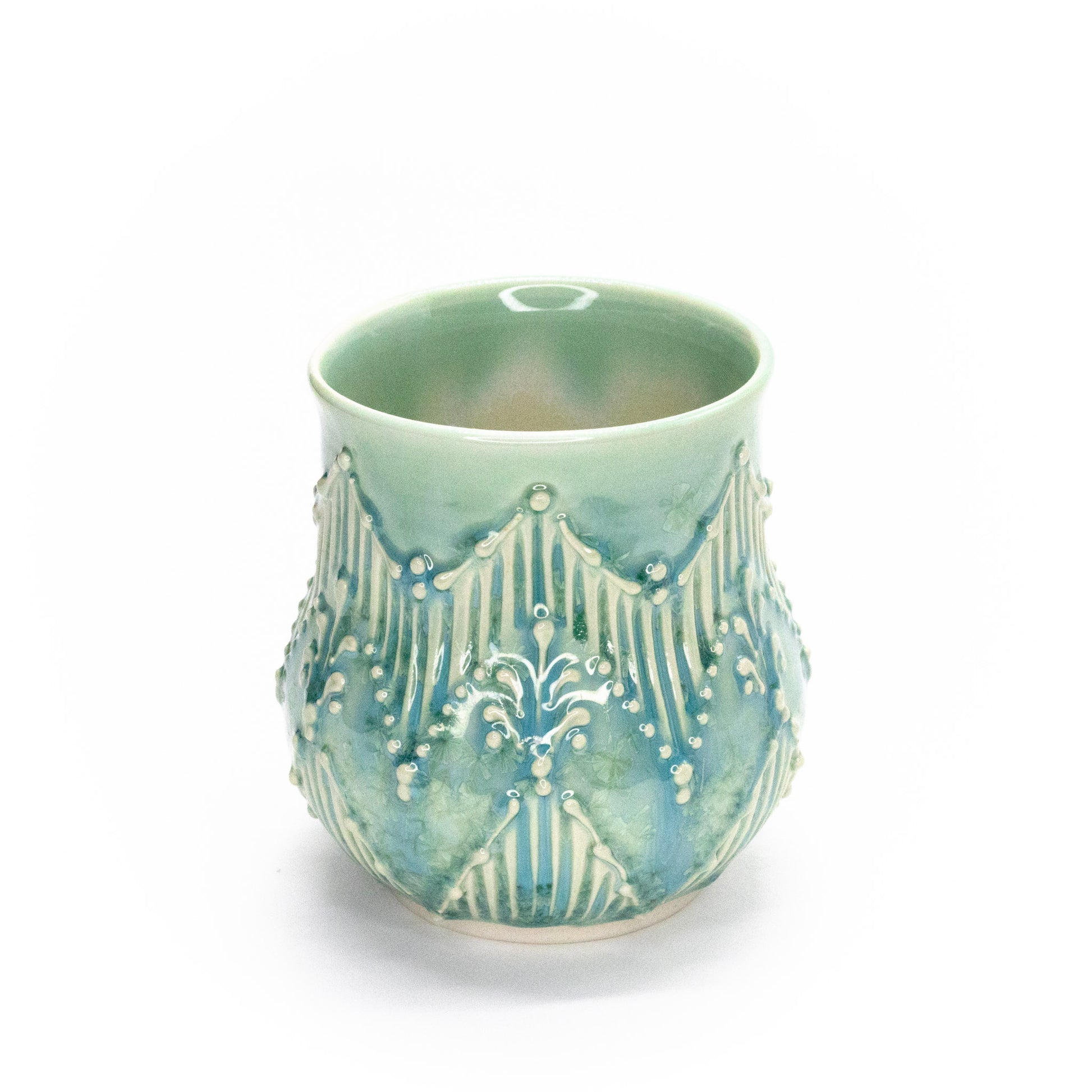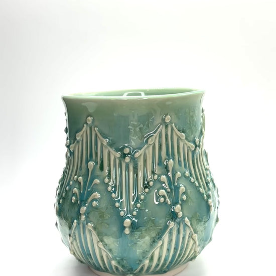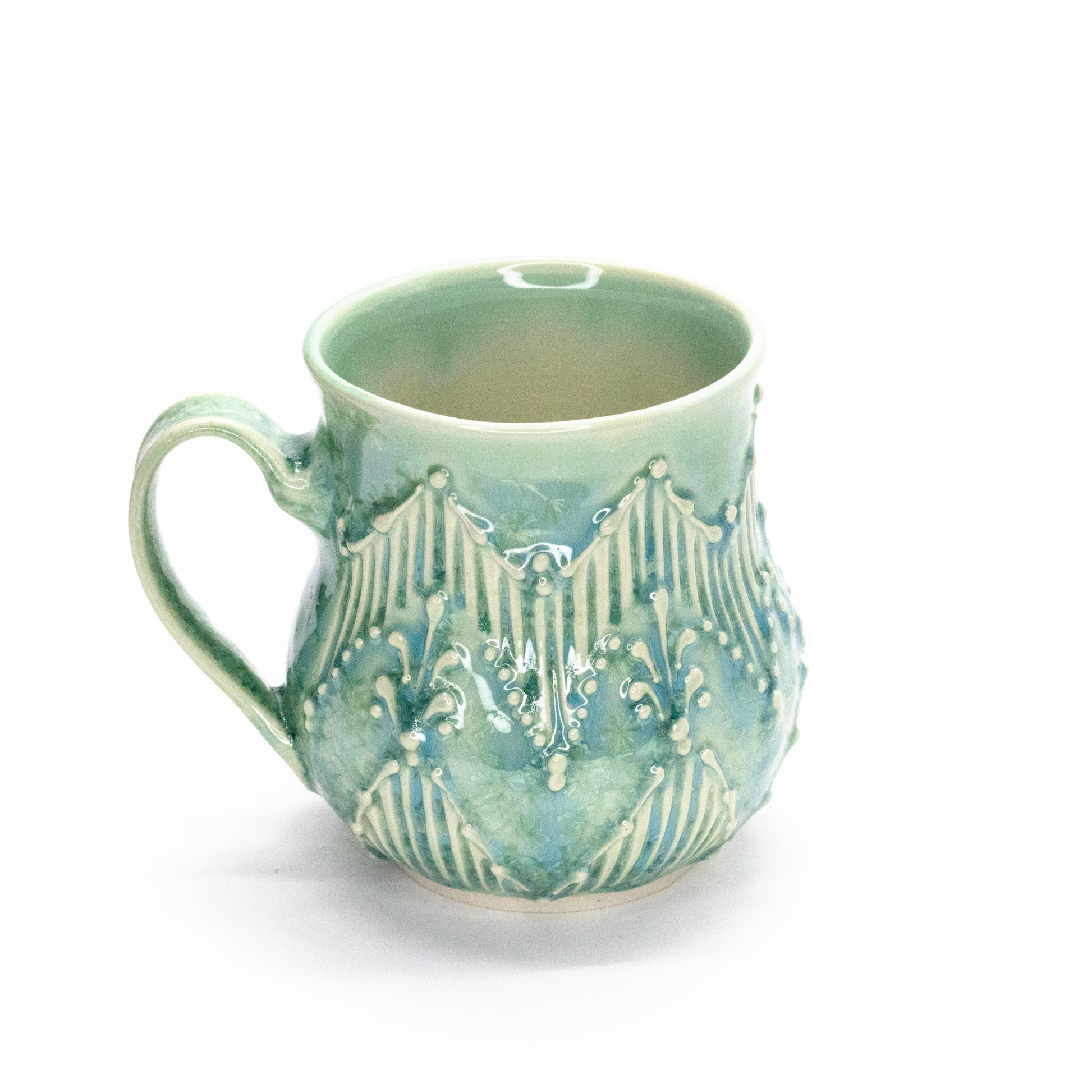 A wheel thrown mug made from translucent porcelain fired to cone 6 in oxidation. It is decorated with a zig zag design created by carved lines and slip trailing, and has a glossy white liner glaze with a turquoise crystalline glaze on the outside. It is 4" tall x 4.75" wide x 3.75" deep, holds 13oz, and weighs 0.6lbs (278g).