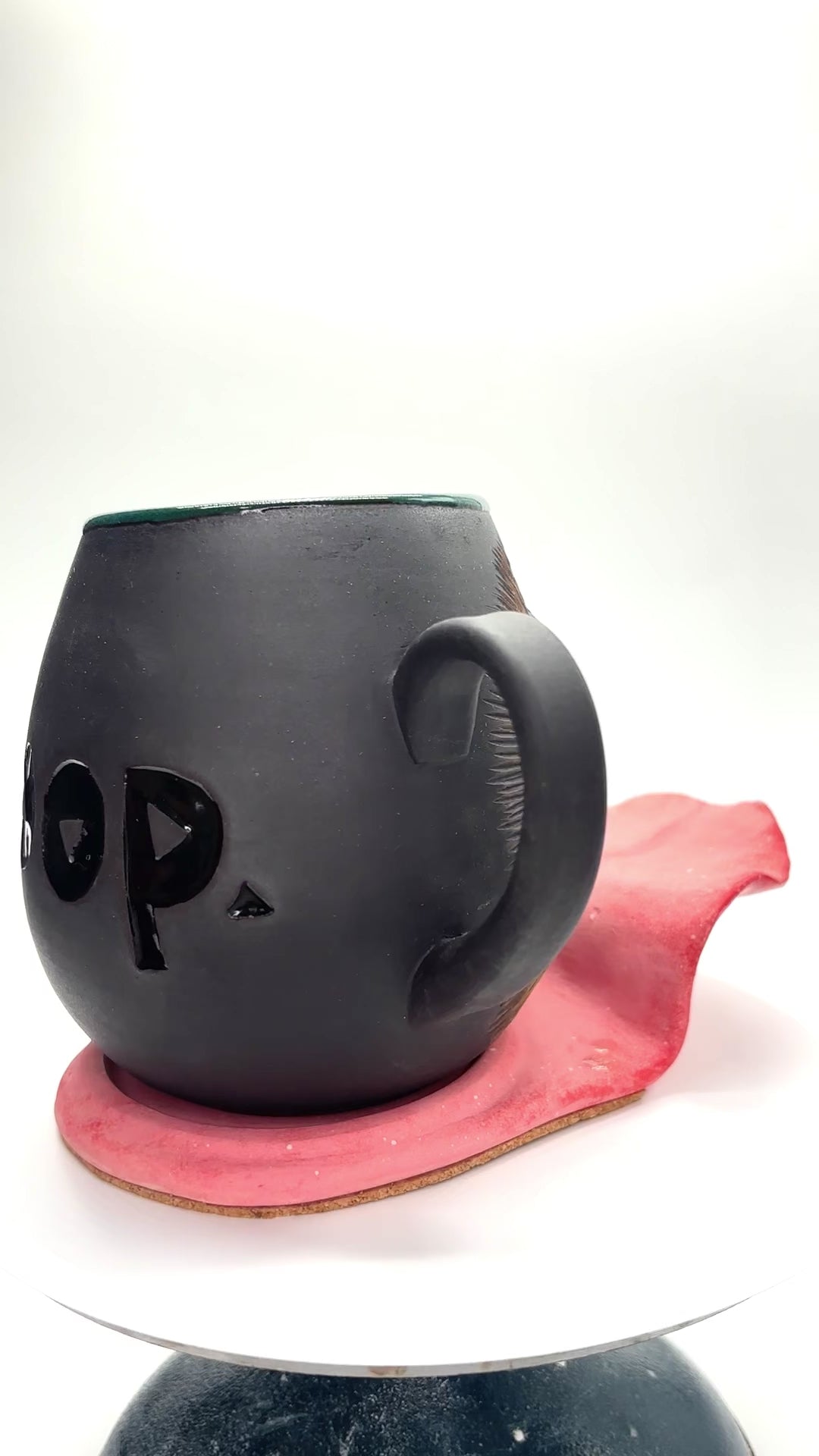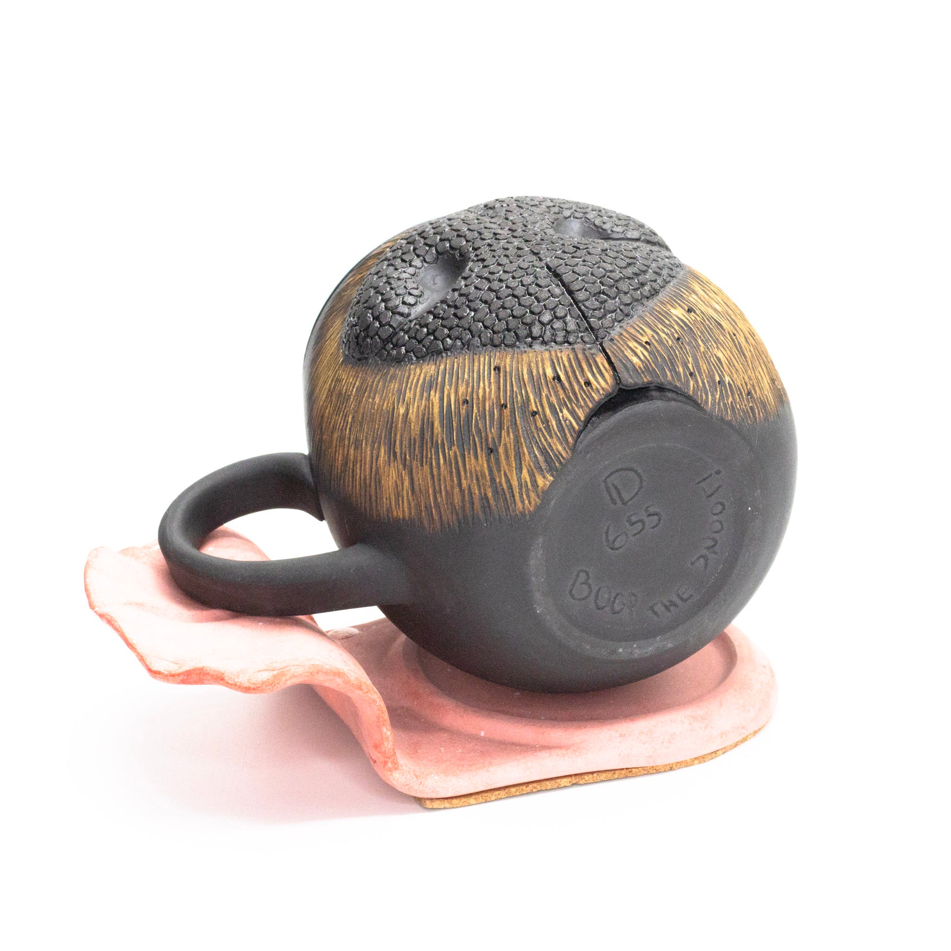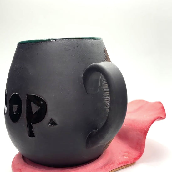 Thrown ceramic cup, altered, sculpted and carved to form a dog nose, and handbuilt dog tongue coaster (which can also hold your tea bag). The backside of the mug has the word "Boop" carved, and both the word and the nose texture have been inlaid with glaze. Both pieces have been painted with underglaze and sanded to a smooth finish, the inside of the cup is fully glazed. The coaster is sealed with food-safe liquid quartz and finished with cork on the bottom The tip of the tongue features textured clear glaze to look like drool. Both piece were fired in an electric kiln to cone 6. The cup is 4.25" tall and holds 20 ounces of liquid, the coaster is 6" x 4" x 2".