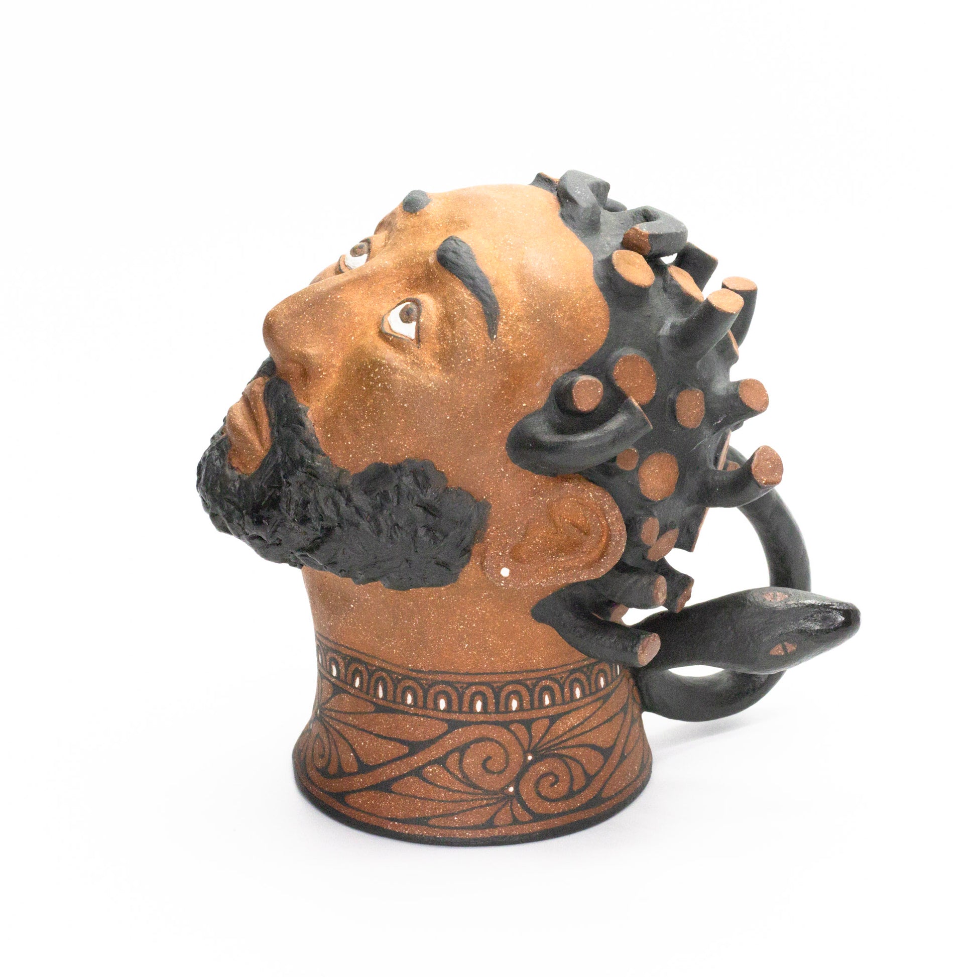 Materials: stoneware, underglaze, matte glaze, liquid quartz. Firing: electric cone 5.5. Dimensions: l 6" x w 4.5" x h 6". Volume: about 21 oz. when filled to the brim. Extra Description: the head is sculpted and hollowed, and the neck/lip is wheel thrown. This mug is fully functional, but it is designed to be a little uncomfortable to use. When holding the handle with your right hand, your mouth lines up with the blood drips. When held with the left, the last remaining snake (which is the handle) "bites" you. This mug is a rhyton, a drinking cup usually in the shape of an animal head.