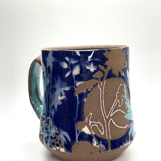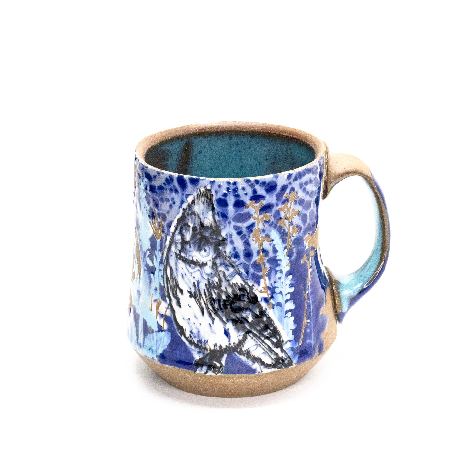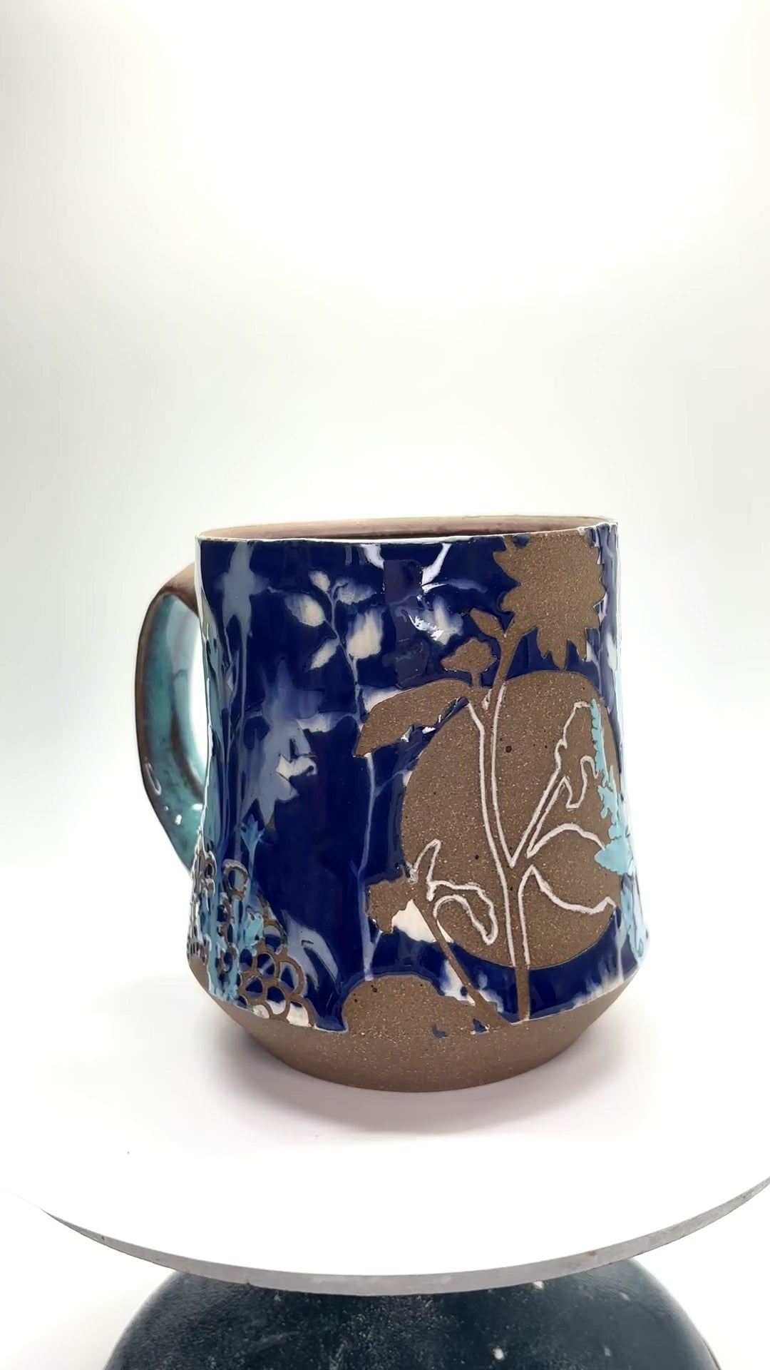 Brown stoneware, colored slips, underglaze, glaze; wheel thrown; cone 6 electric; 16 fl. oz.; 4.25 x 4.75 x 3.5