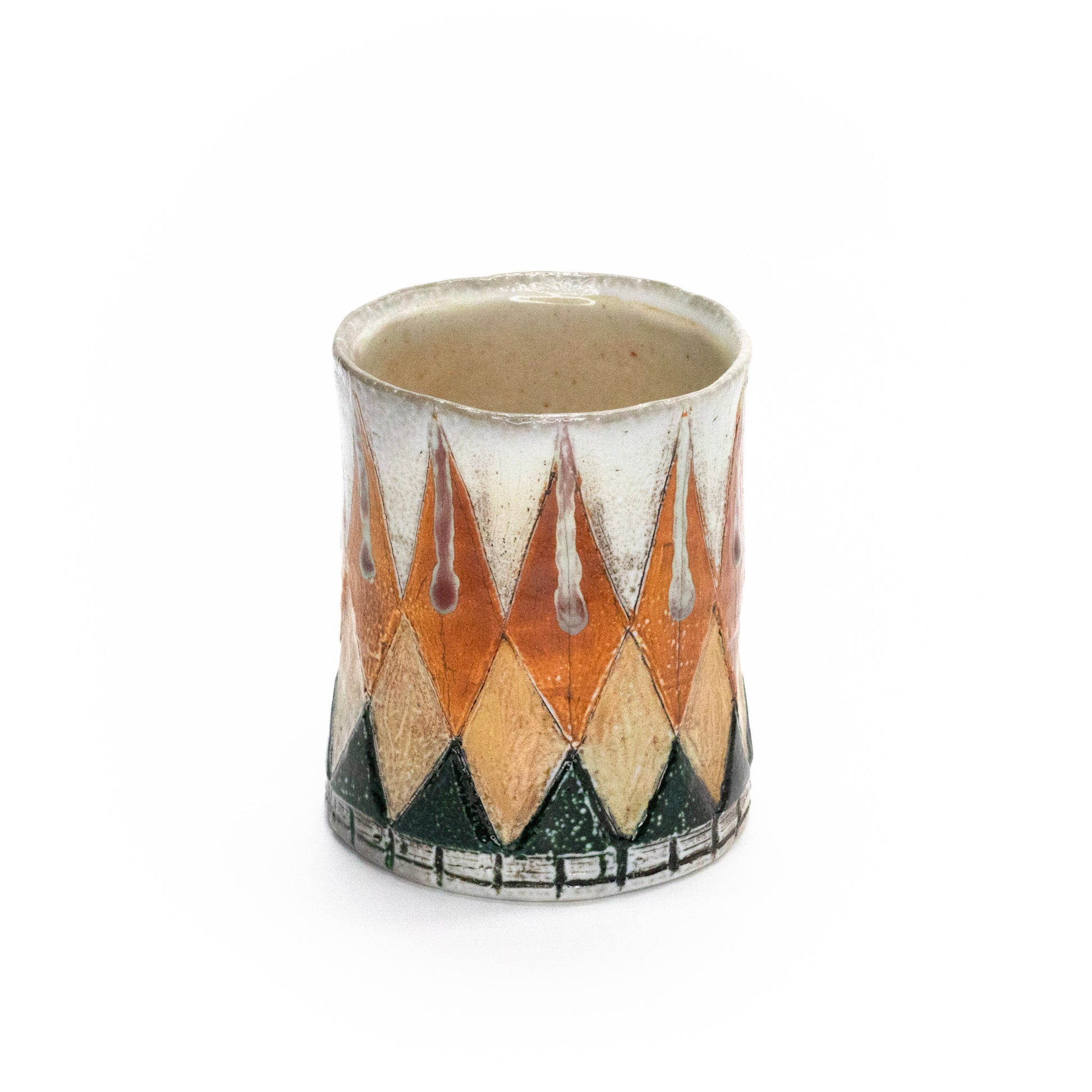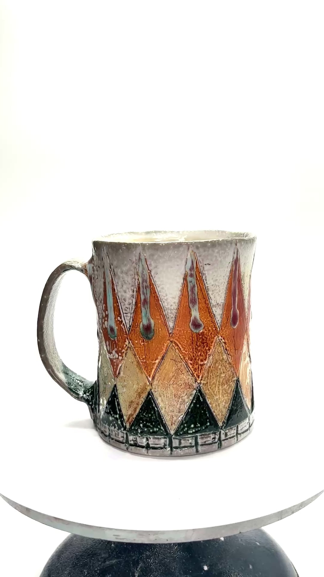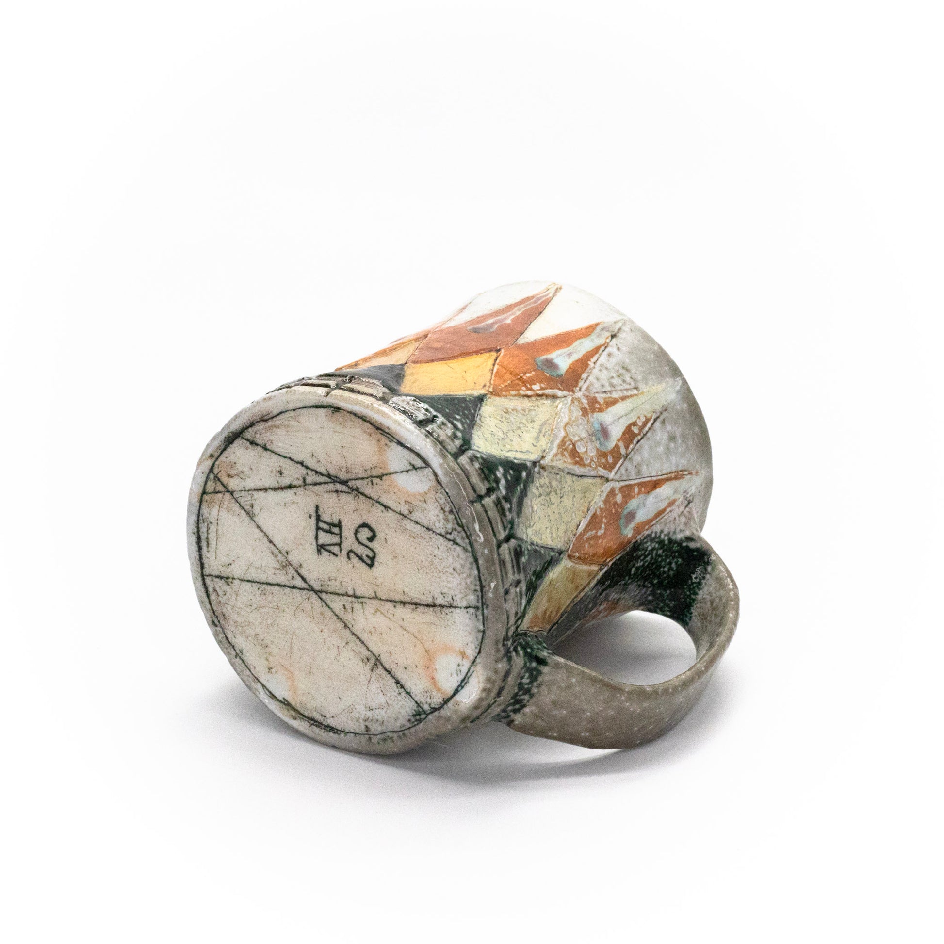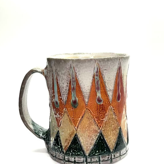 Wheel thrown and hand built, soda fired, flashing slips mason stain, glaze, 4" x 3.25", 12oz