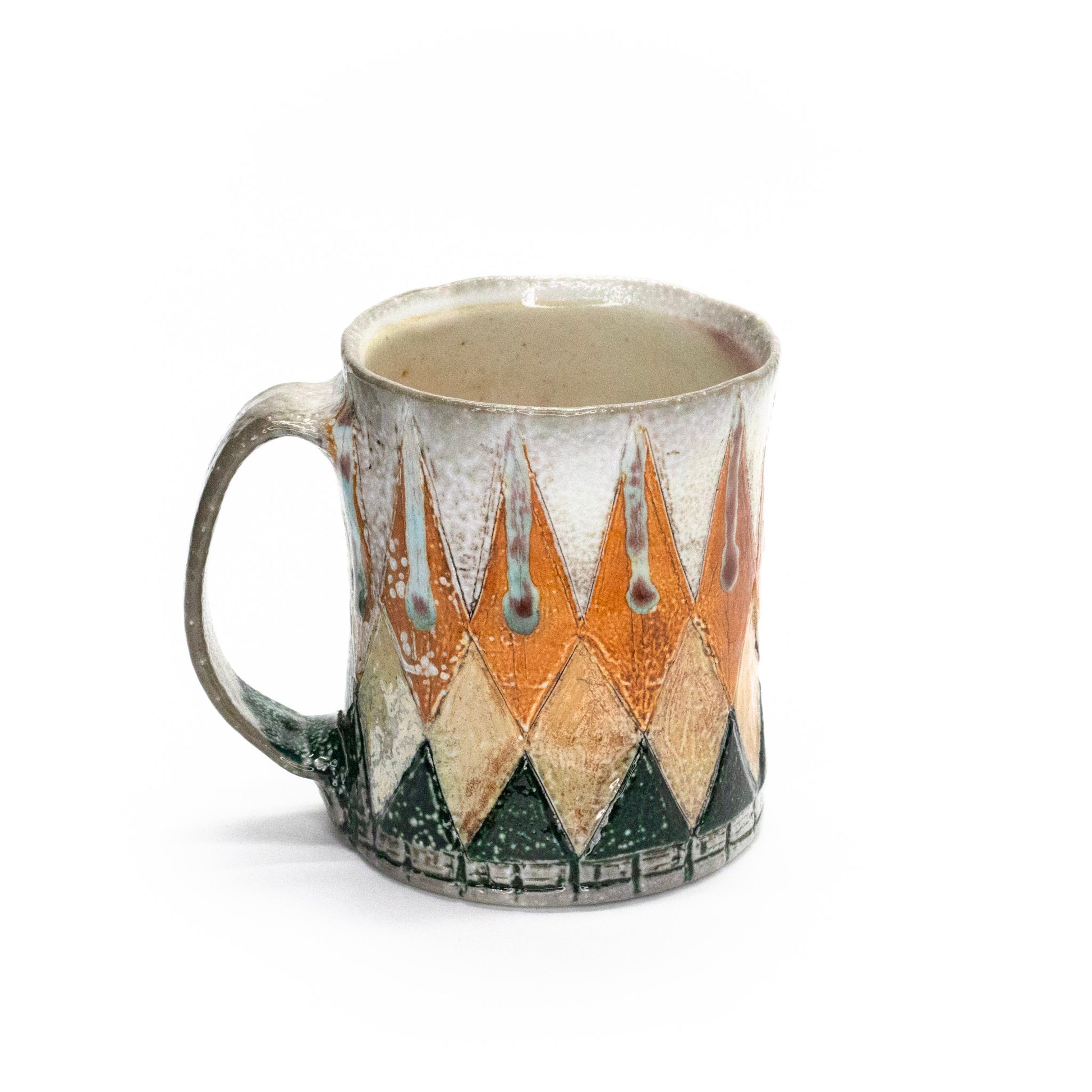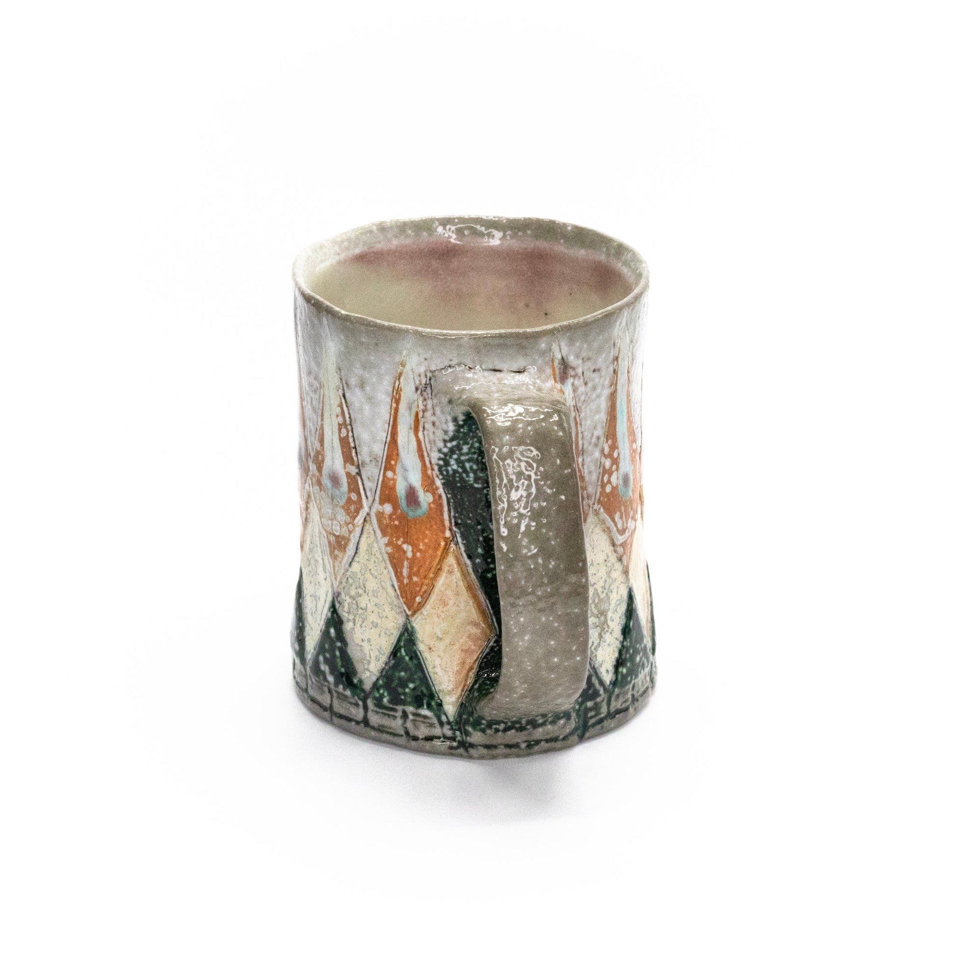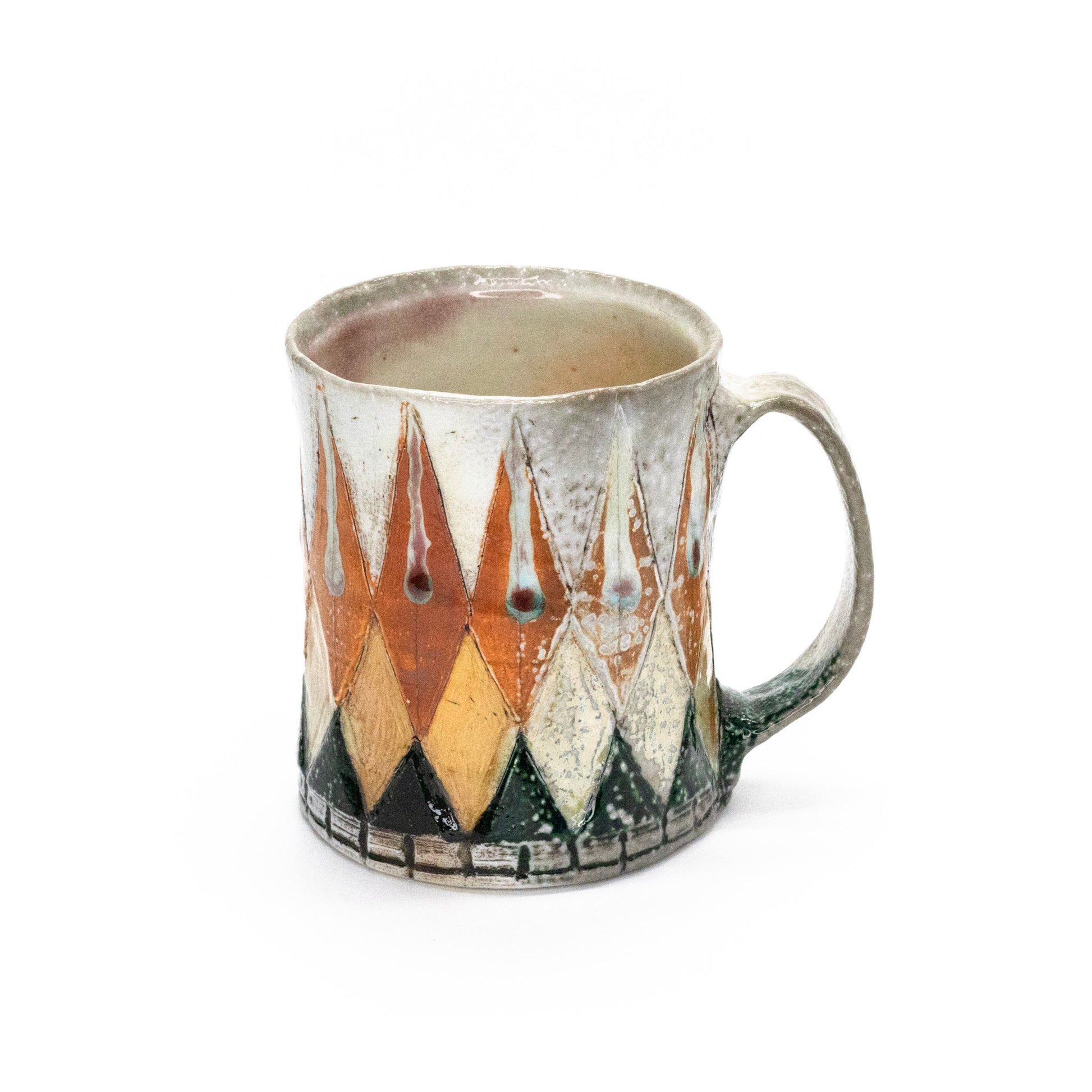 Wheel thrown and hand built, soda fired, flashing slips mason stain, glaze, 4" x 3.25", 12oz