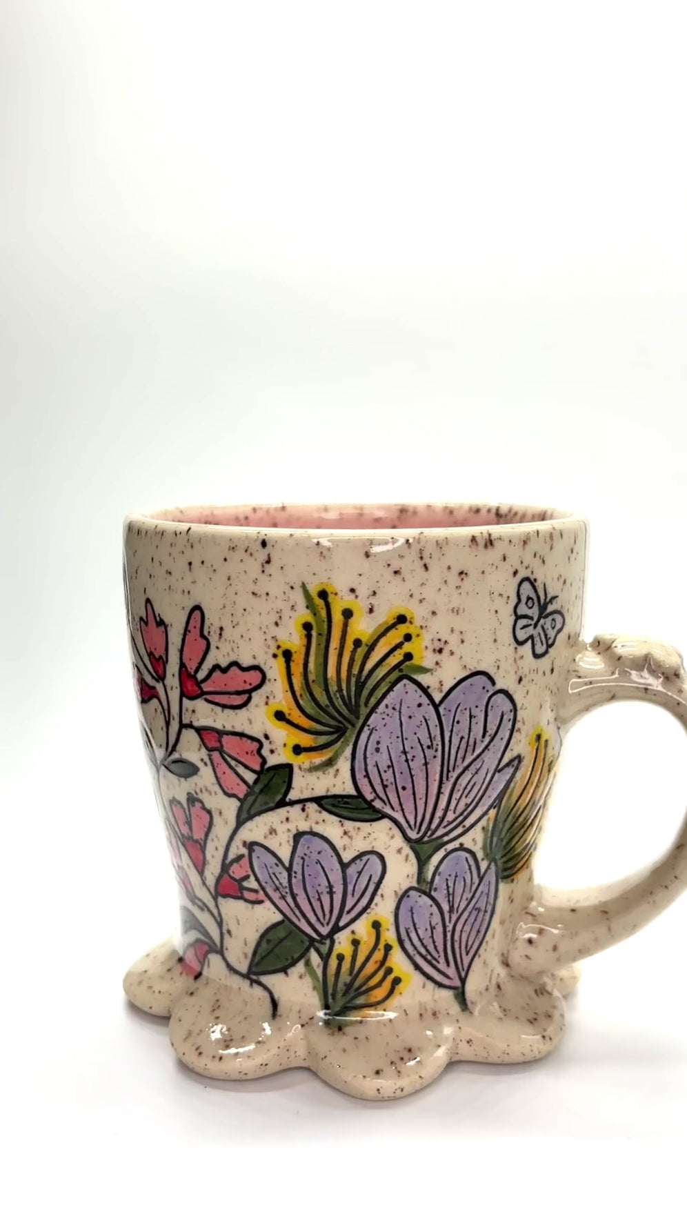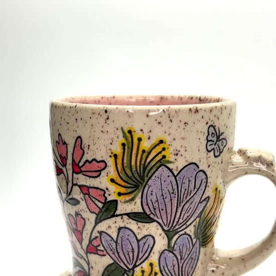 Mug made from a speckled clay body, decorated with flowers & bugs using the Mishima technique. Painted with underglaze & fired to cone 5. Pale pink liner glaze. Includes flower petal base & flower thumb rest. 4.25 inches tall, mug is 3.75 inches wide at the opening, 5 inches wide including the handle. Holds 14 fl oz, microwave & dishwasher safe. Made with love in 2025!