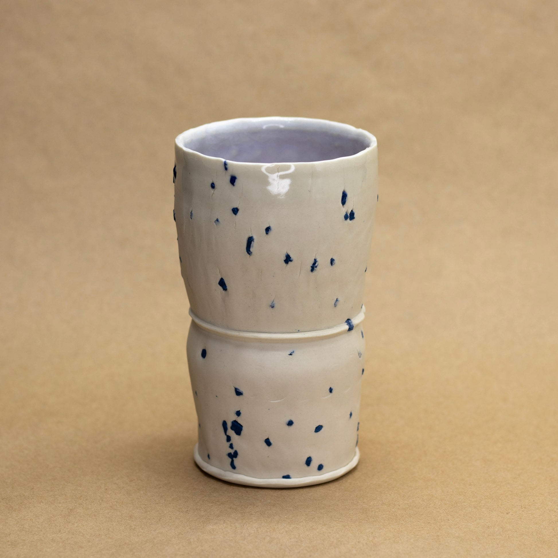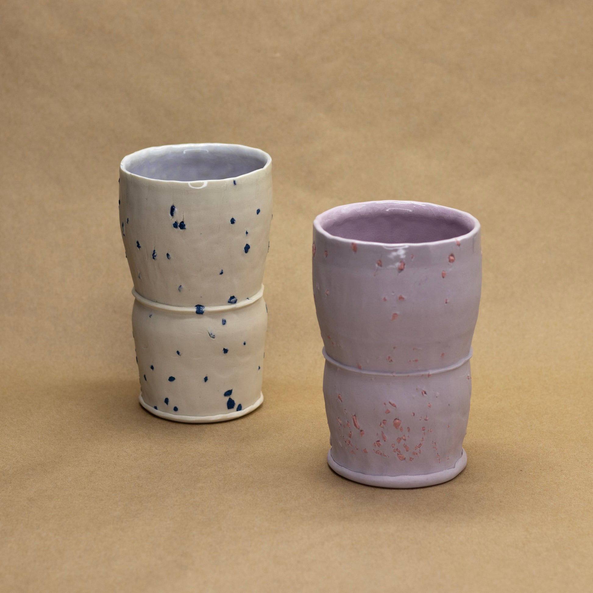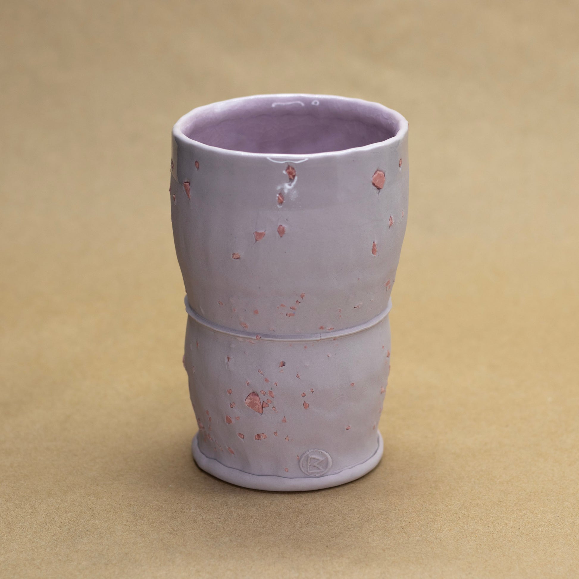 Tumblers made from cone 6 handbuilt colored porcelain, colored grog, and glaze. Each sold separately. Handwashing recommended. White cups hold 14 oz, purple cups hold 16 oz.