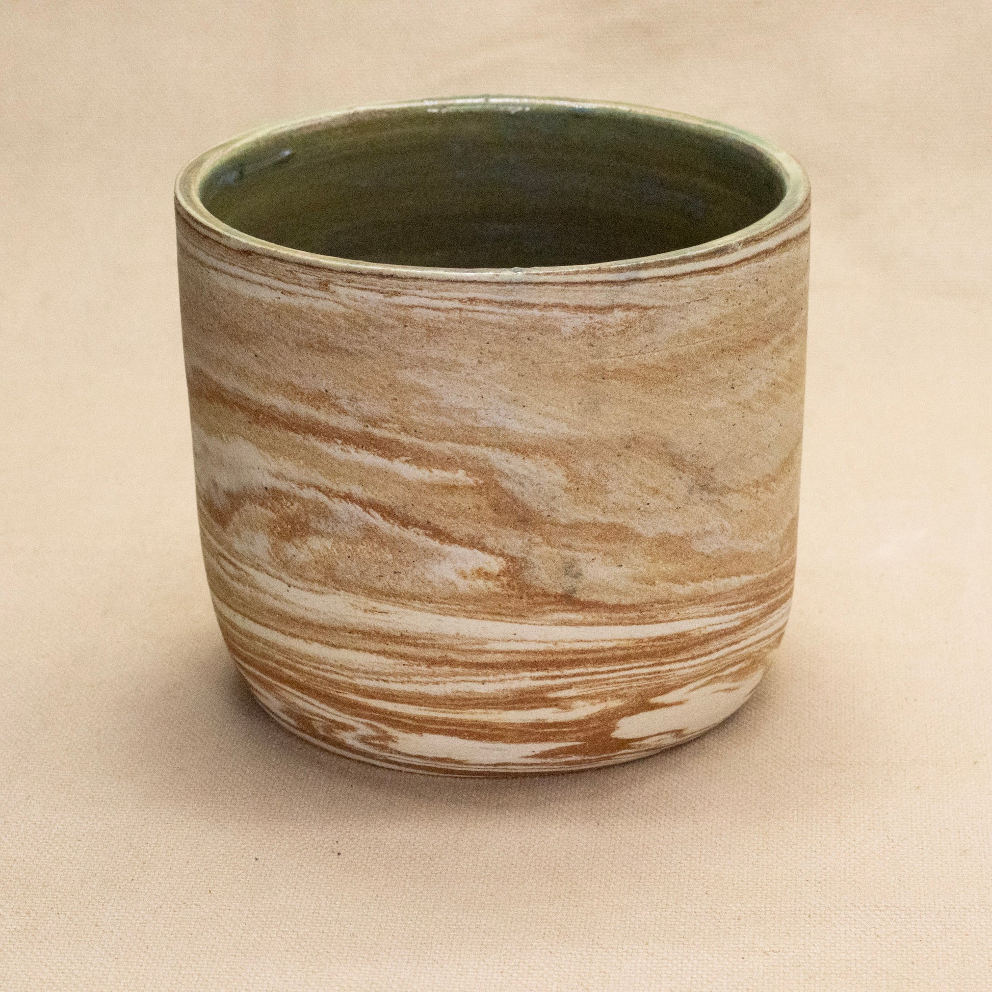 A marbled planter with a green interior. Measures 5.5" in diameter and 4.75" tall. Pre-drilled with a drainage hole.