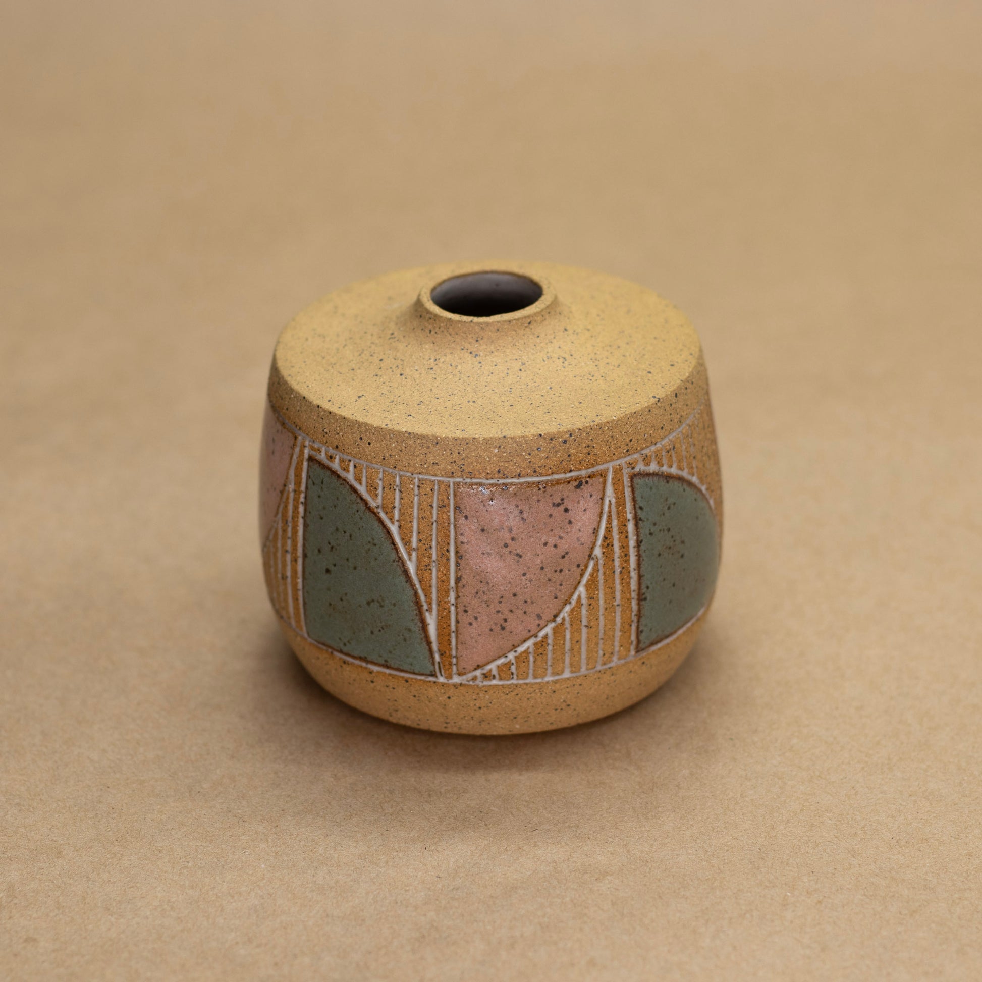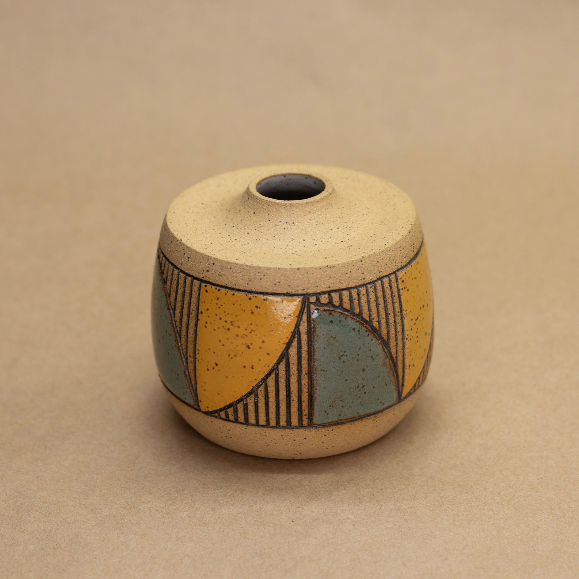 Hand carved bud vase with glaze inlay. Glazed interior to hold fresh or dried flowers.