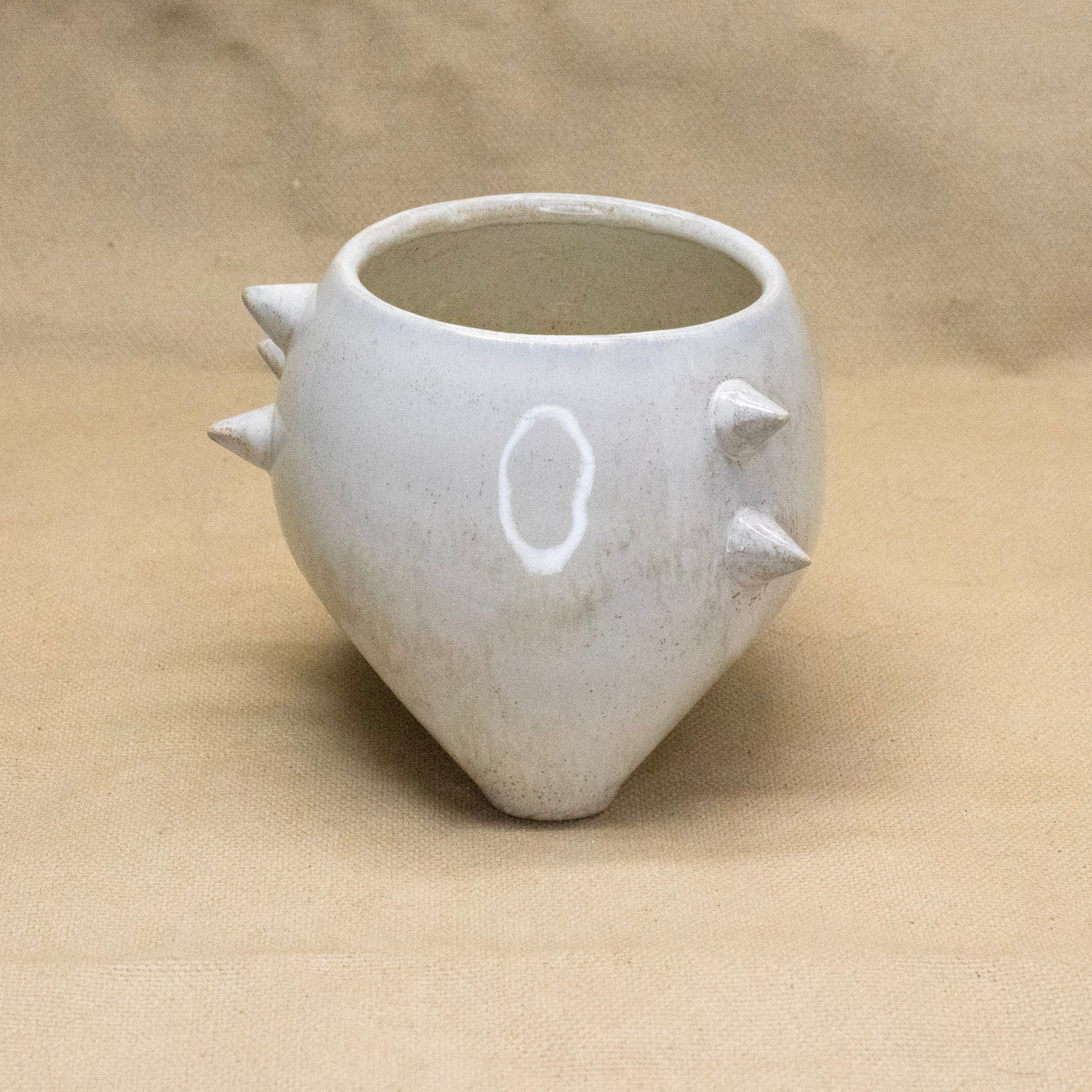 A wheel thrown and altered spiky vase with a silky white exterior and speckled interior. Textured and glazed. 4" by 4". Not recommended for food.