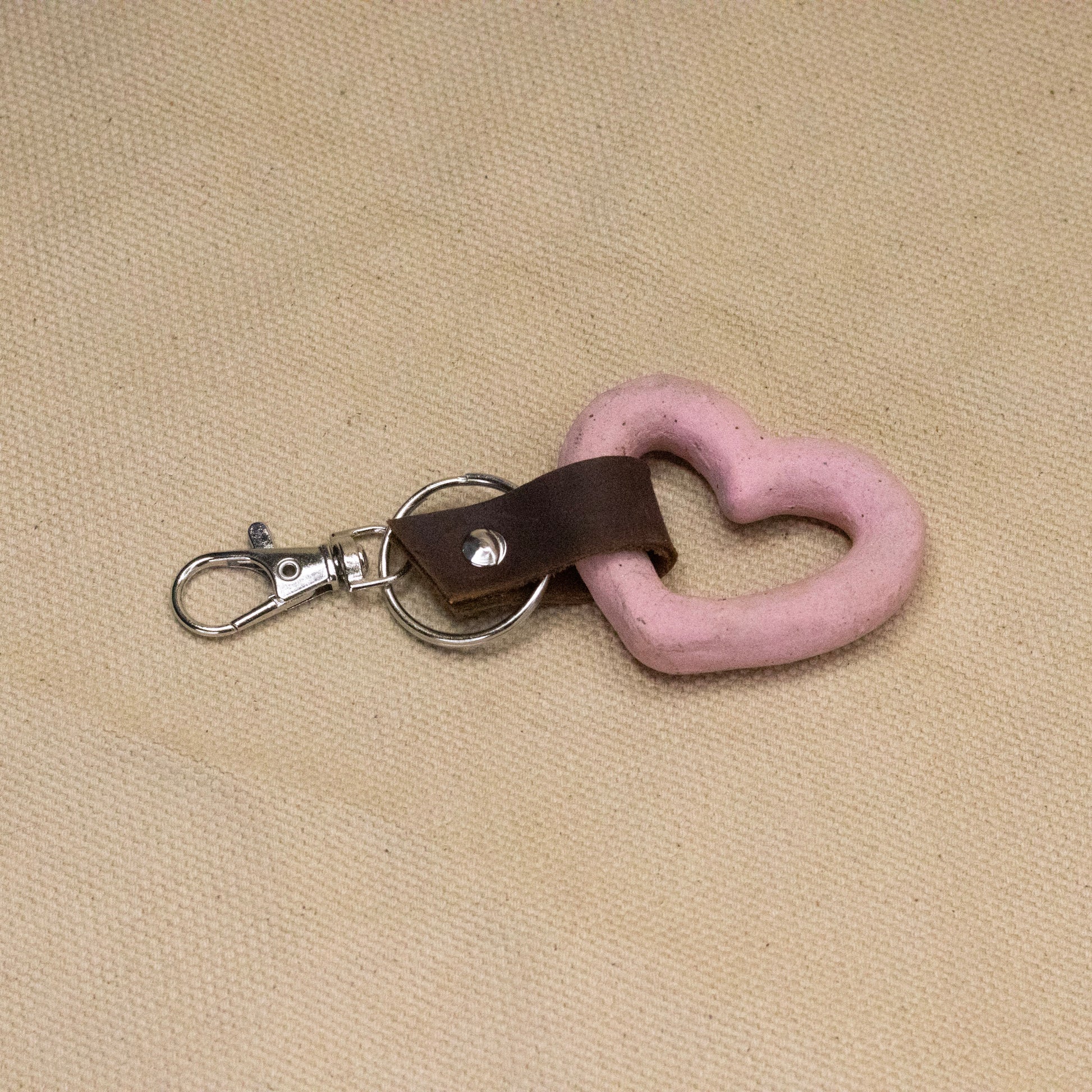 A pink heart attached with a leather keychain. Hang it from your bag, your pants, or your keys.