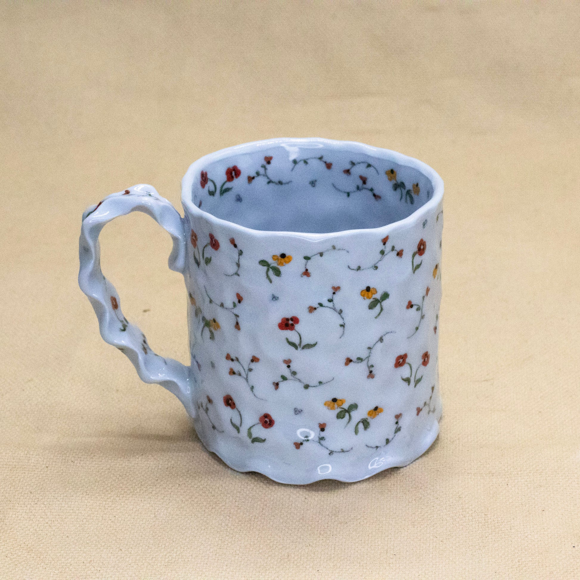 Hand-built, hand-painted porcelain mug, mason stain, with a glossy clear glaze and fired to cone 5. Microwave and dishwasher safe, holds 12 oz. Each mug sold separately.
