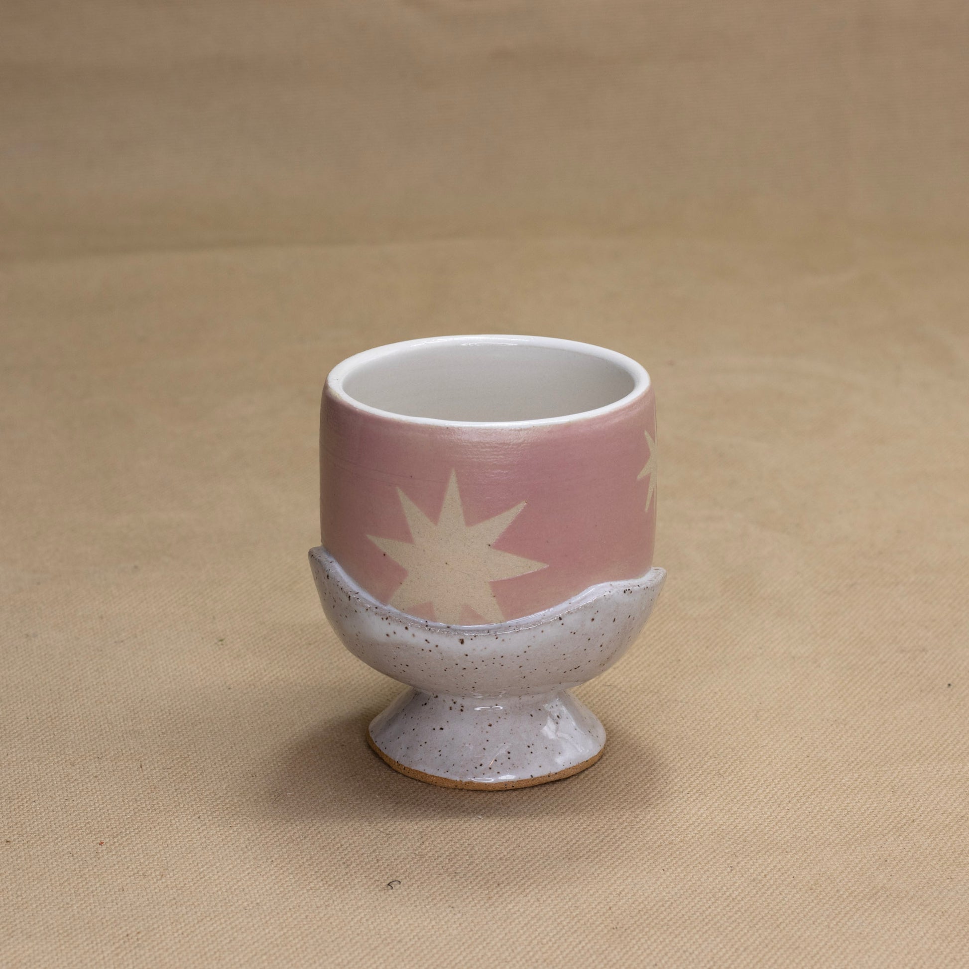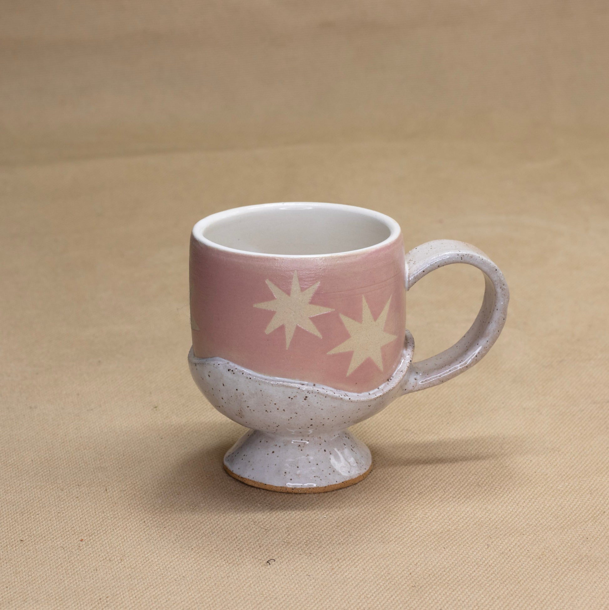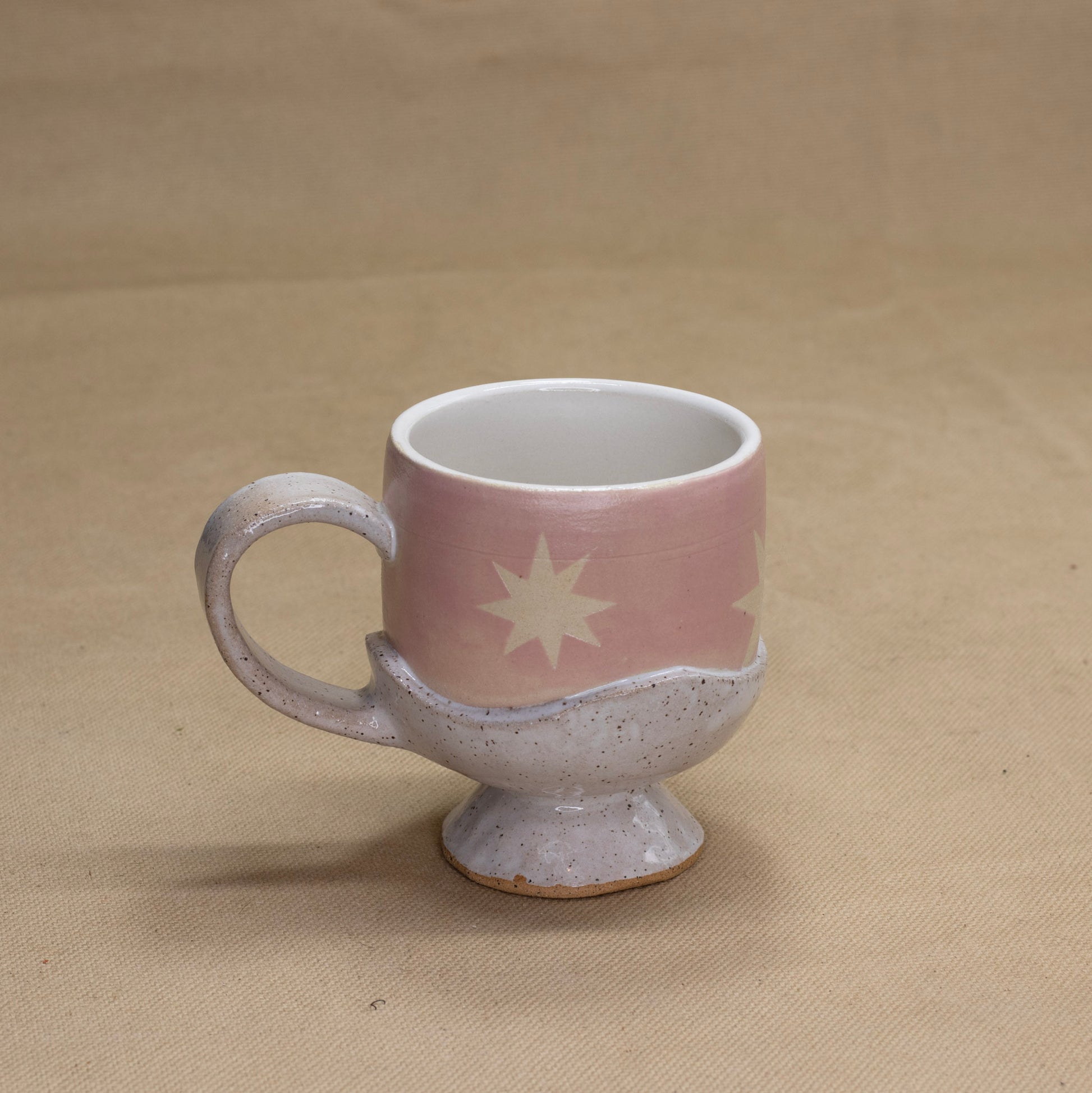 White stone peeks through a star relief pattern with sheer pink glaze on the cup; tan speckled clay covered in shiny white glaze forms the pedestal and handle.