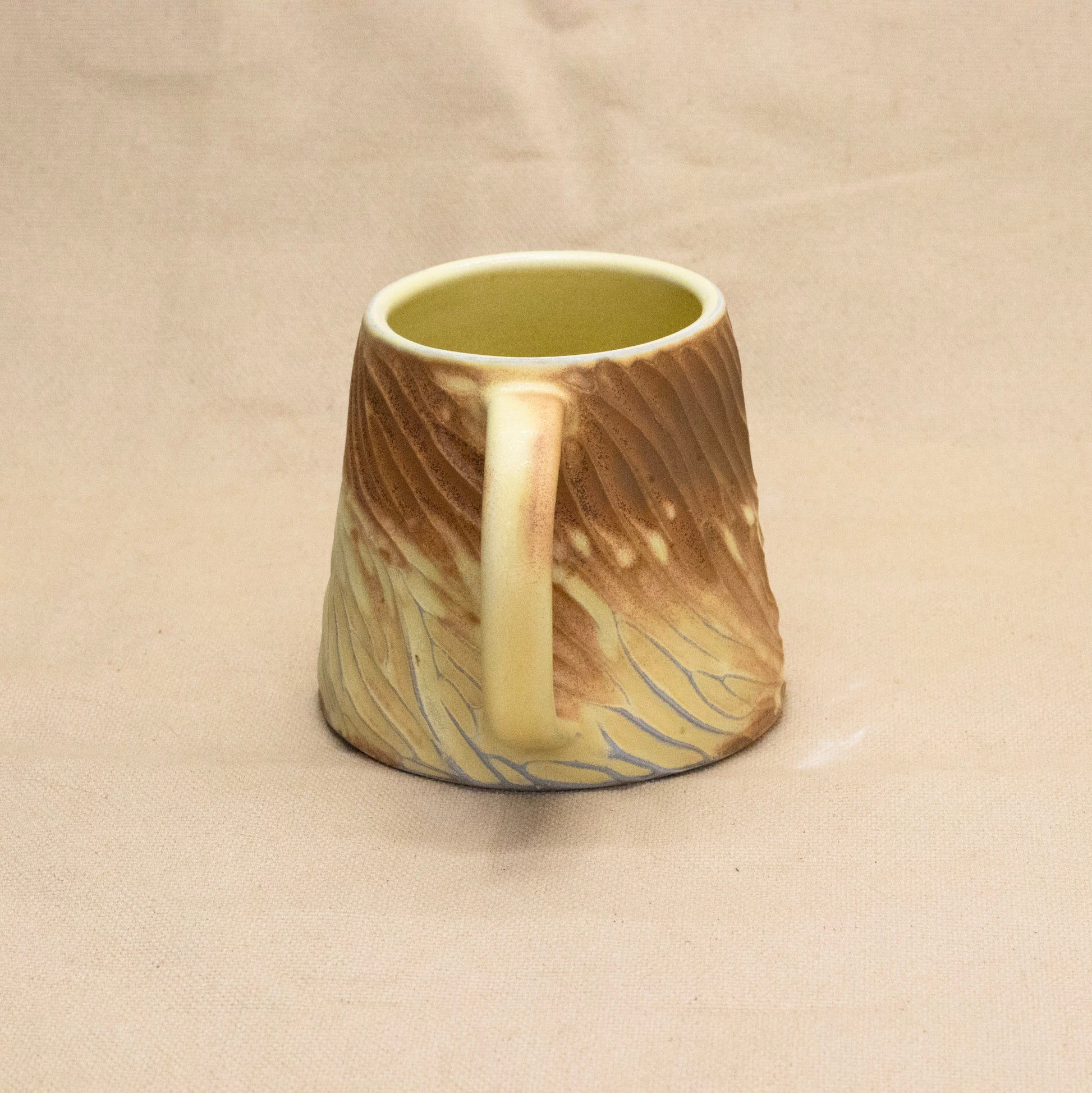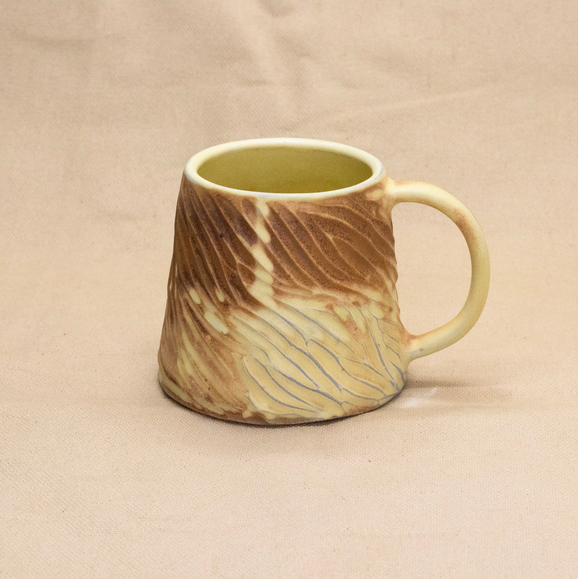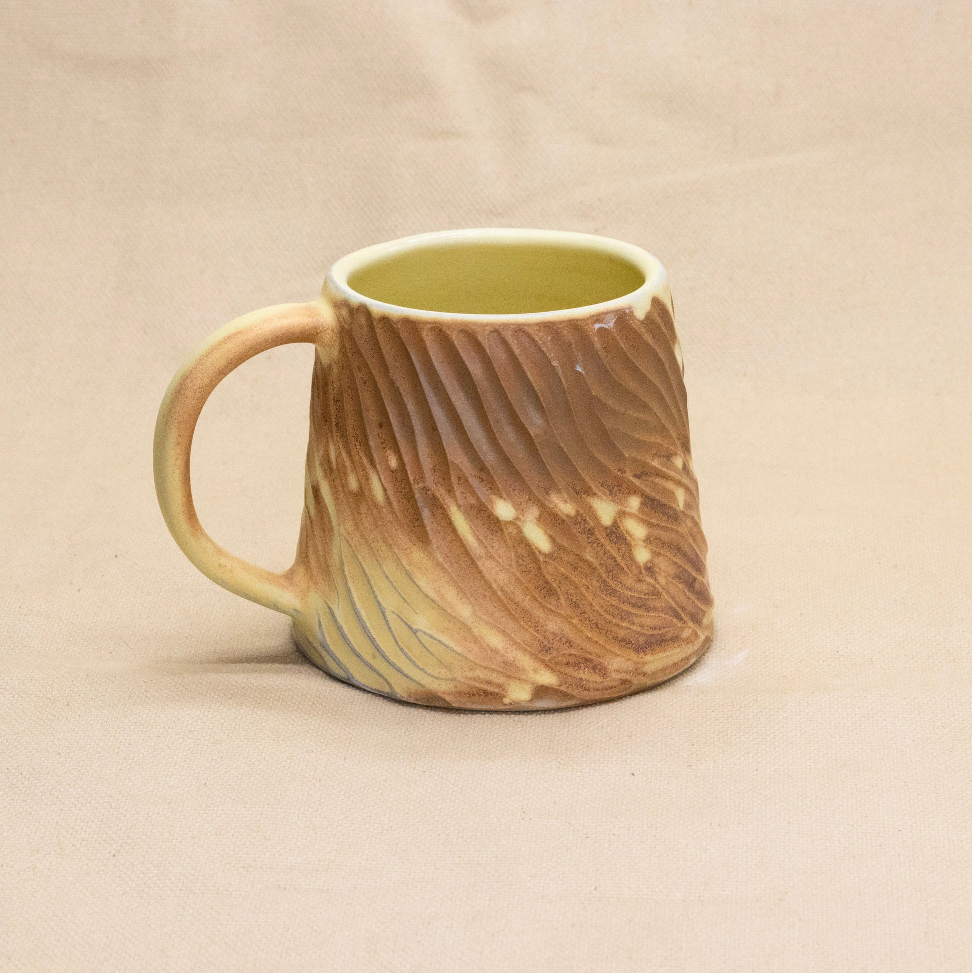 This toasty banana crème pie colored mug has tapered sides and an overall carved design inspired by waves. Porcelain, yellow salt glaze, soda-fired to cone 10. Microwave and dishwasher safe, handwashing recommended. Holds 14 oz.