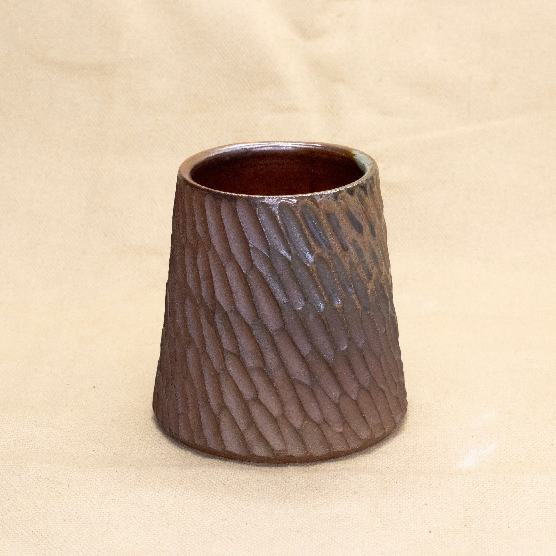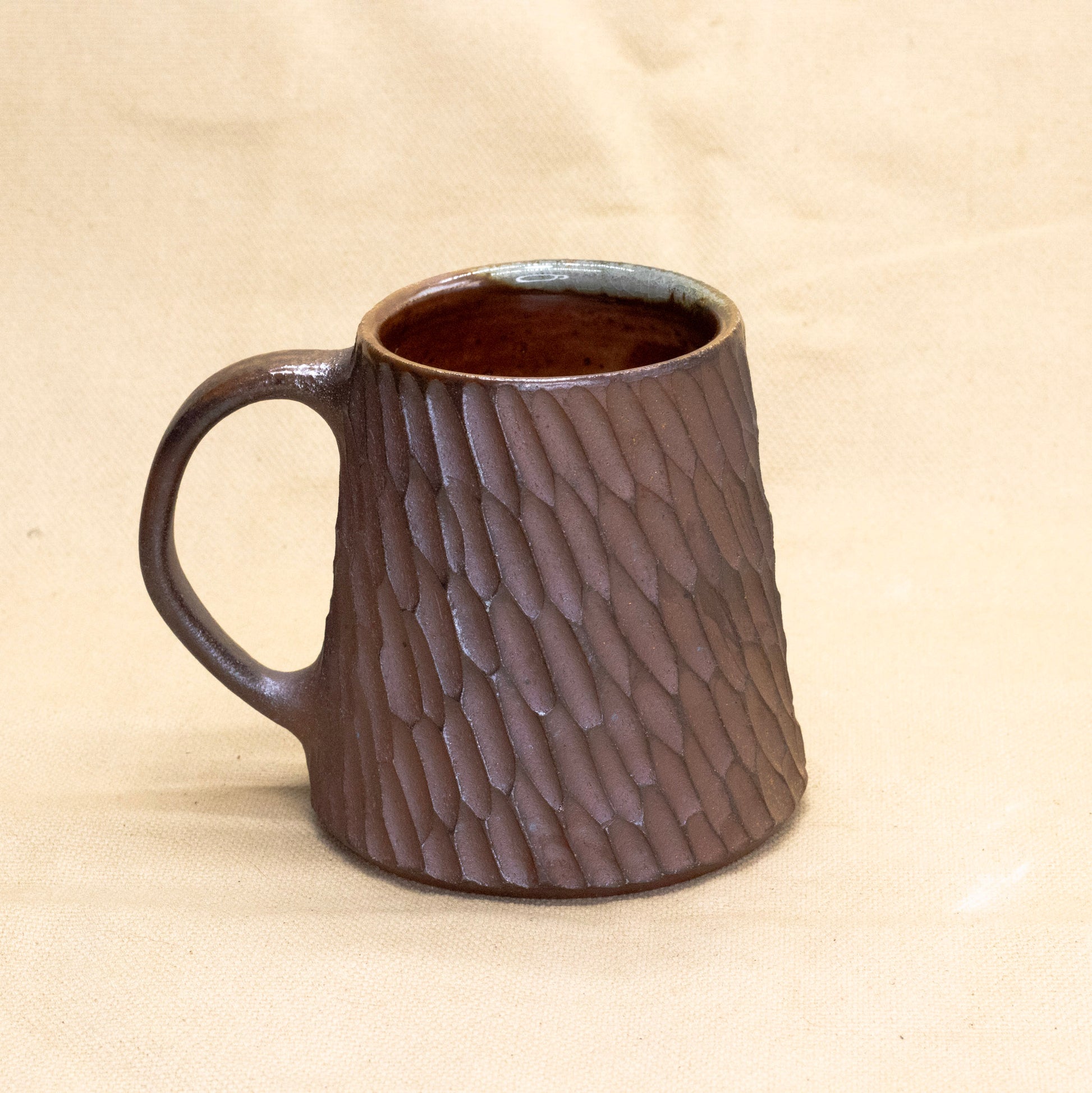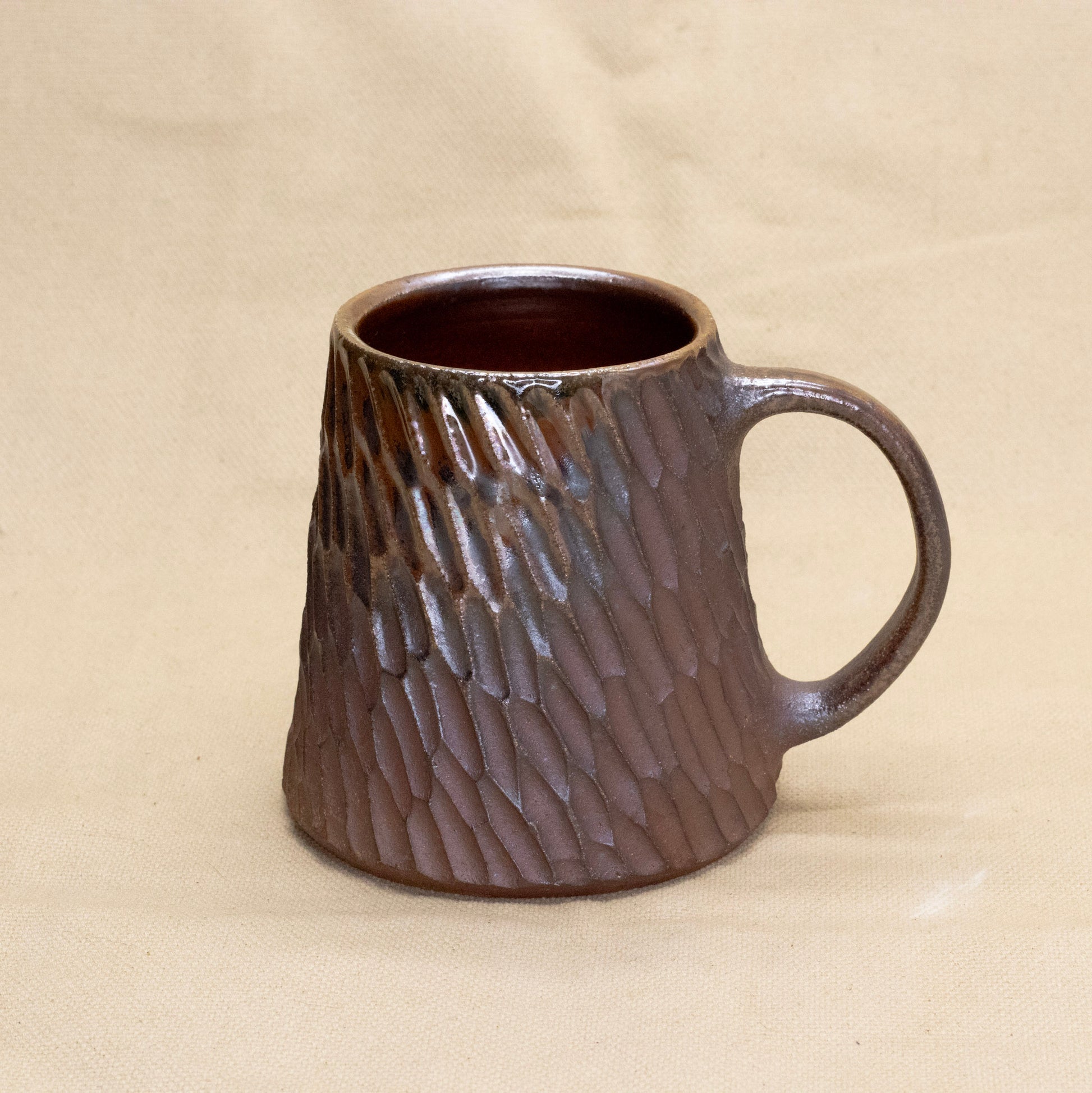 This mug is the rustic burgundy-brown of well-worn leather. The interior of this mug with tapered sides and an overall carved design inspired by rain is a nice red shino. Stoneware, red shino glazed interior, soda-fired to cone 10. Microwave and dishwasher safe, handwashing recommended. Holds 16 oz.