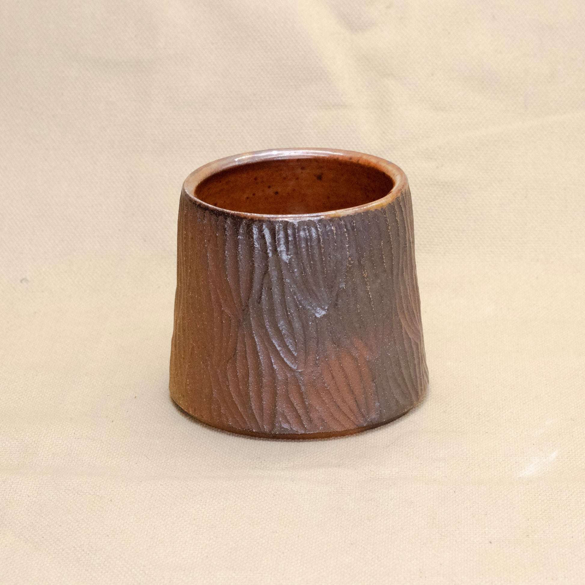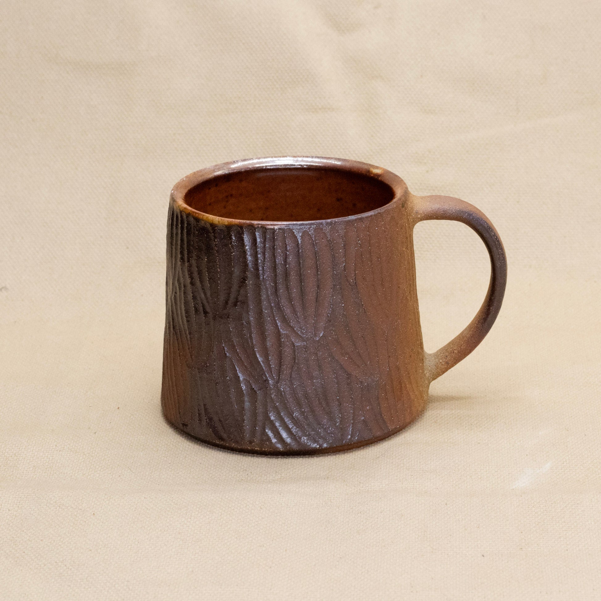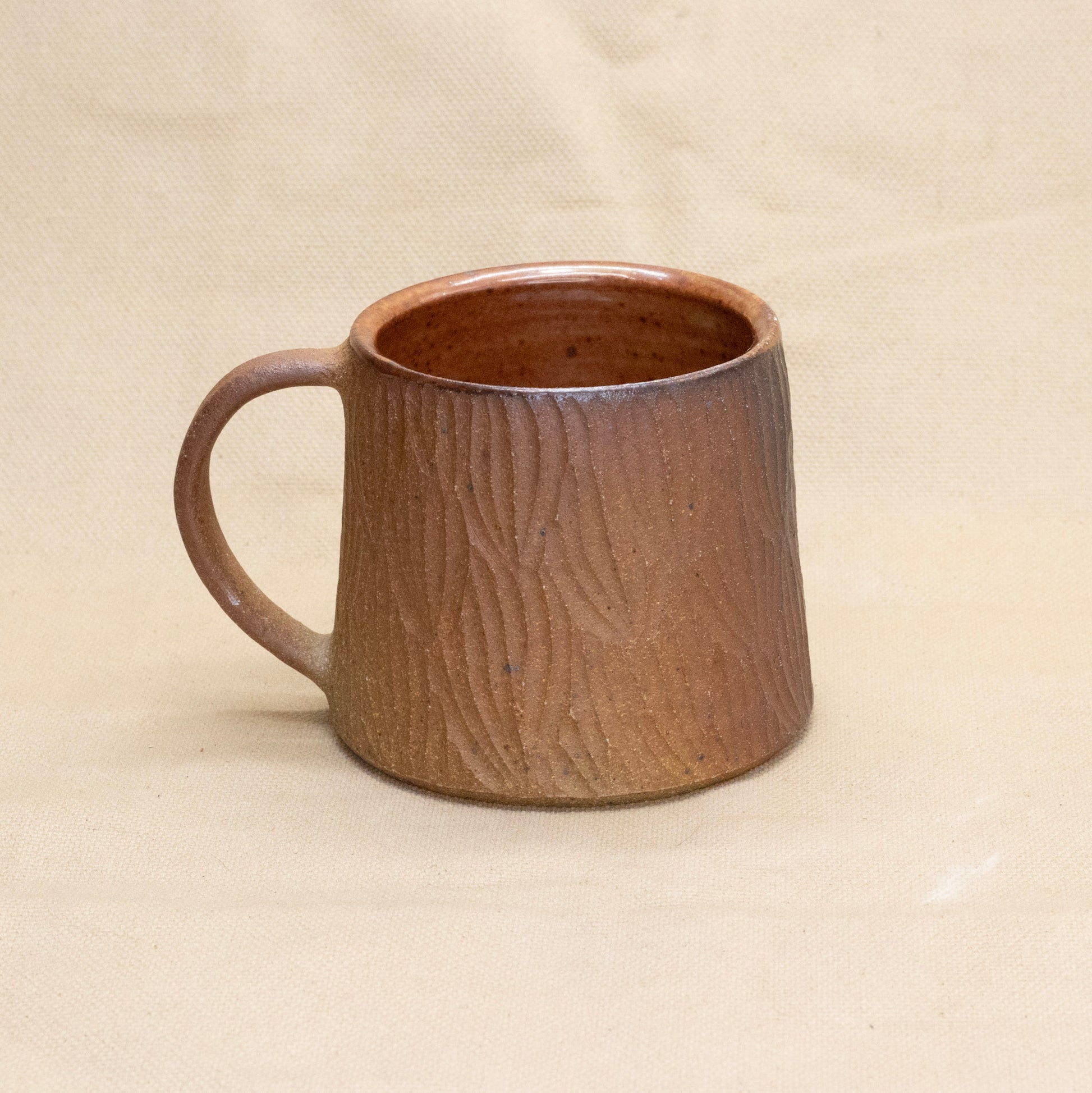 Cozy autumn tones of russet, brown, and a speckled red shino interior. This mug has tapered sides and an overall carved design inspired by fields of wildflowers, with some bonus carved flowers on the bottom. Stonewre, red shino glazed interior, soda-fired to cone 10. Microwave and dishwasher safe, handwashing recommended. Holds 12 oz.