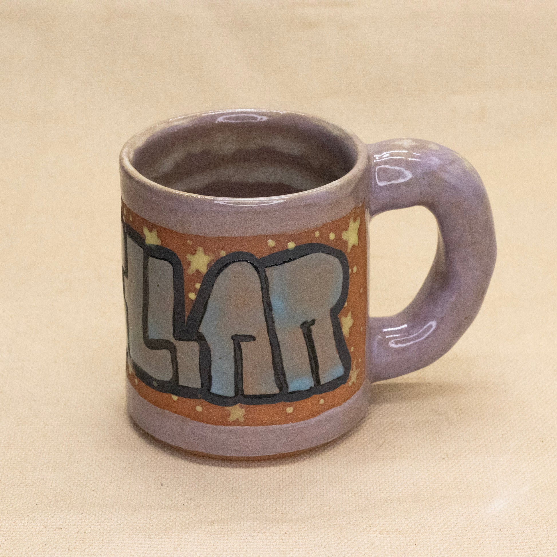 Stellar mug with a hollow handle can make a shiny start to a day. Dishwasher safe, holds 12 oz.