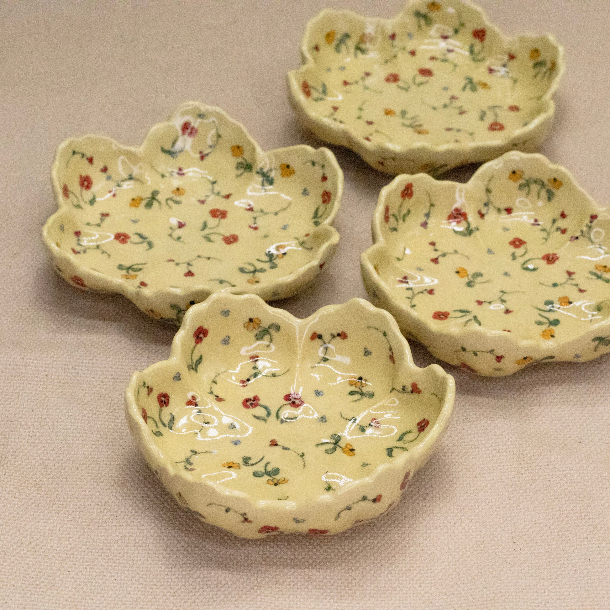 Hand-built, hand-painted porcelain bowl, mason stain, glossy clear glazed and fired to cone 5. Microwave and dishwasher safe. Measures 4" across.