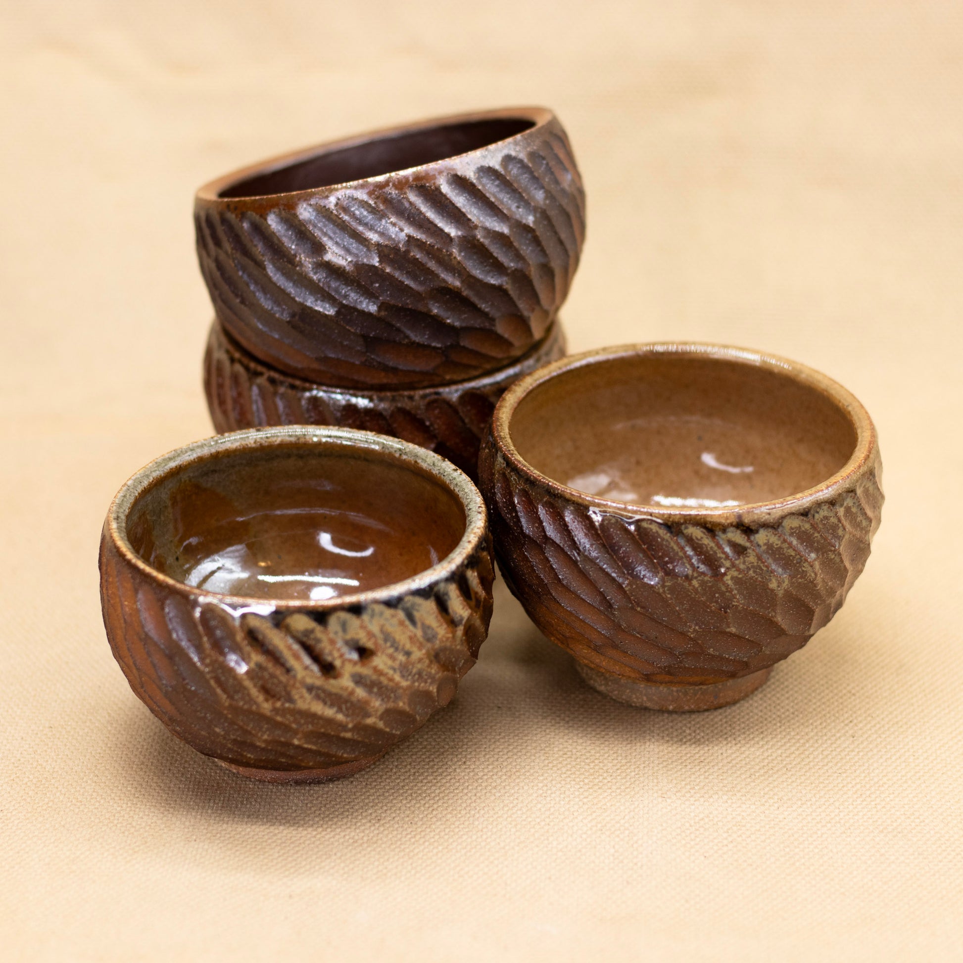 Footed tea bowl with carved design inspired by feathers on a bird's wing. Dark red shino-glazed interior and soda-fired to cone 10.