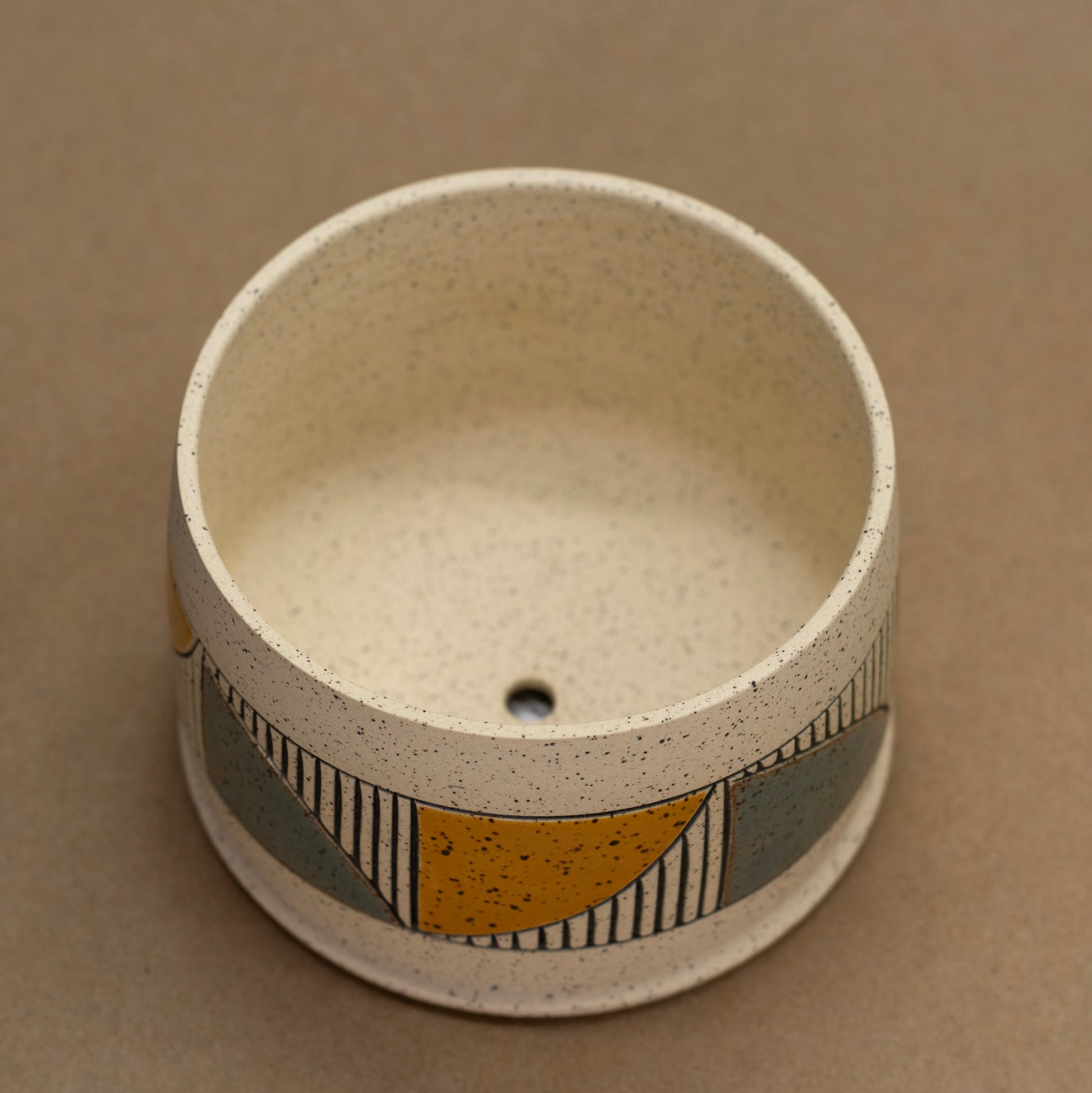 Hand carved planter with glaze inlay. Inside is unglazed and has a drainage hole at the bottom with planter plate included.